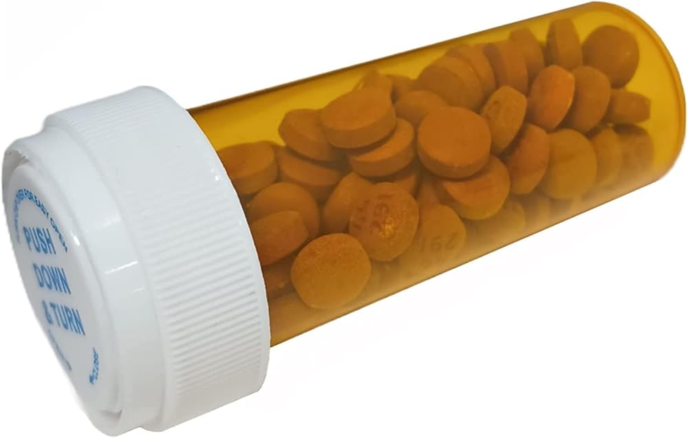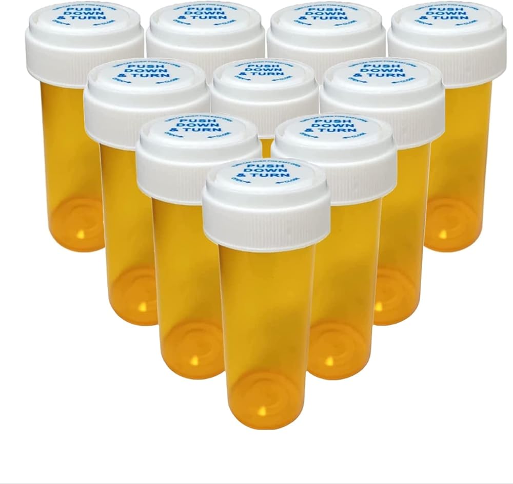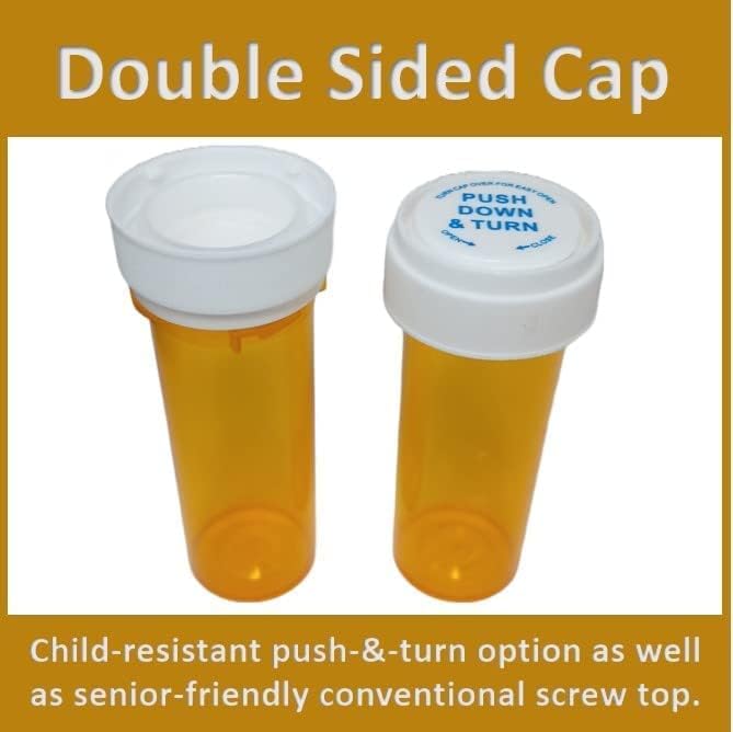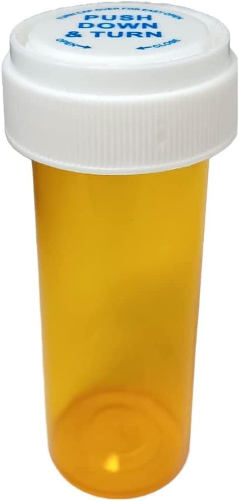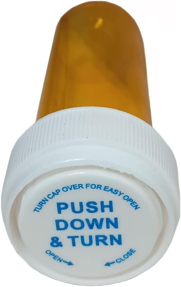 SAFE AND SECURE – Push, turn and hold down cap helps offer kid and senior safe option that meets child-resistant and senior use requirements. DIMENSION: Each pill bottle measures 3.25 inches (not including lid) Height 1.25 inches Wide and holds 16 drams. MULTI-USE - Perfect use for storing and taking on the go, medication, pills, vitamins, supplements, and glucose tablets. TRANSPARENT – Amber vials that can easily be seen through allowing you to find exactly what you want with nothing more than a quick glance. MEDICAL GRADE - Large bottles made from medical grade plastic for uncompromising storage with the tight moisture resistant seal.