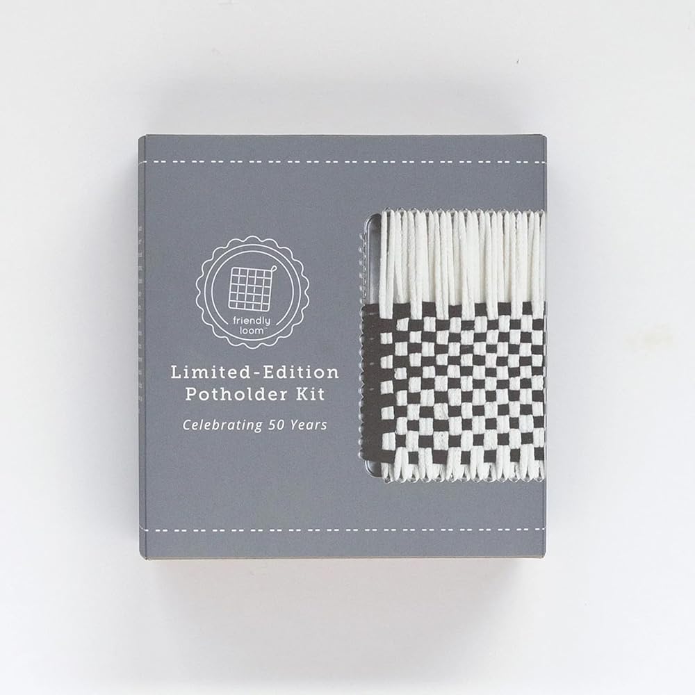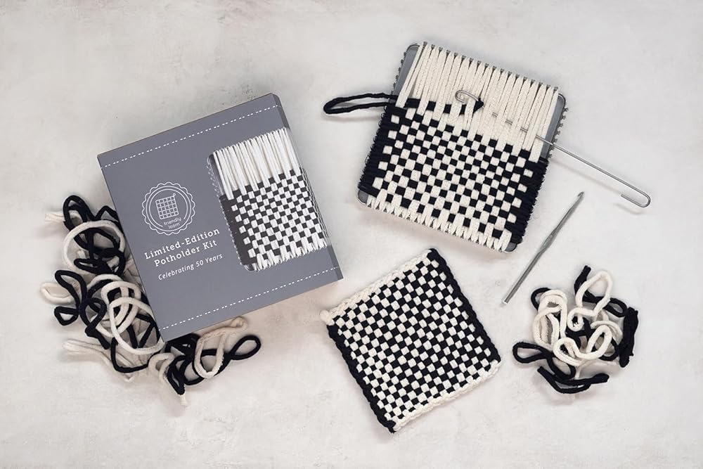 Harrisville Designs 7" Potholder (Traditional Size) 50th Anniversary Loom Kit makes 4 Potholders. Children can enjoy this quiet-time activity, perfect for rainy days, play dates or car trips. While having fun, they are learning hand-eye coordination, patterning, and refining fine motor skills. Hand weaving, knitting and felting are wonderful intergenerational activities your whole family can share. The Harrisville Designs 7" Potholder 50th Anniversary Loom Kit includes: Sturdy Metal Loom 7" x 7" Black and White 100% Cotton Loops, 2 Hooks (one metal for loop weaving and one plastic for finishing) Illustrated instructions for lots of ideas. 2018 enhanced loom improved to help loops stay nicely in place during weaving! Makes 4 Potholders. All Harrisville products are made in the USA. From the Manufacturer Established in 1971, Harrisville is a small, family-owned and operated business. We believe that quality should not be compromised for even the smallest product. Our goal is to preserve and share the textile heritage of our small New Hampshire village, by providing the highest quality materials for easy projects you and your children can make at home.