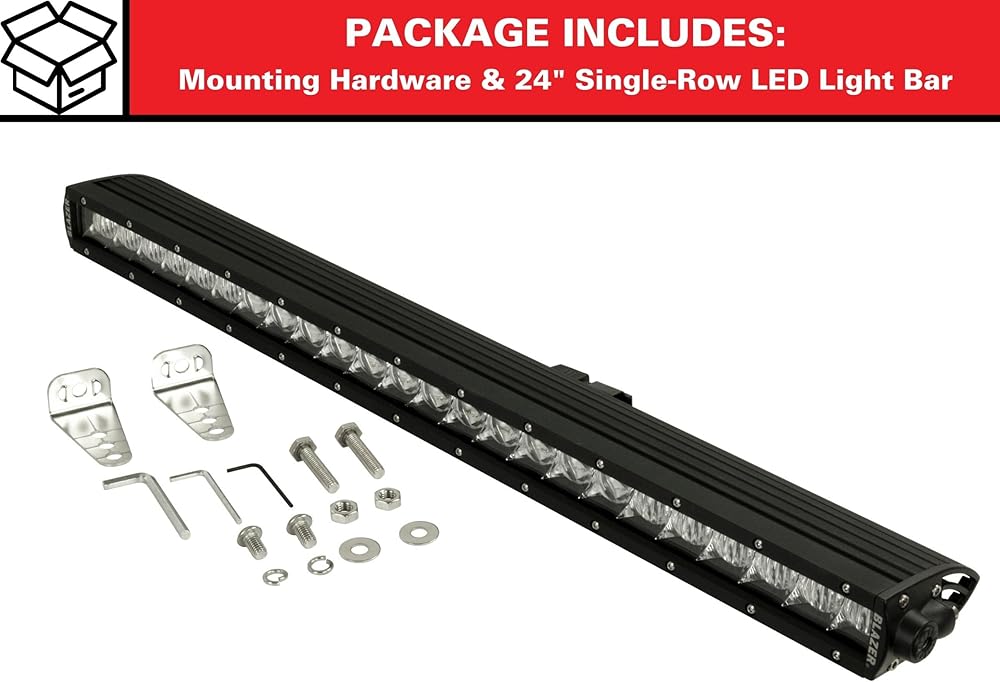 The Blazer CWL524S LED 24" single row off-road light bar is expertly designed to project light both wide and far to maximize visibility while driving. Providing up to 30,000 hours of light, the life of this light far exceeds traditional incandescent lights and at 4.5A, draws significantly less power than traditional halogen bulbs. Constructed with aluminum extrusion housing this LED off-road light bar resists corrosion. The vent fins help dissipate heat quickly. The lens has been engineered with a high-strength, impact resistant polycarbonate material and provides a maintenance free light bar that will last in all weather conditions. The light temperature is 6000K. The off-road light bar is compatible with 12 to 24V systems, making this light perfect for trucks, SUVs, ATVs, boats and many more applications.