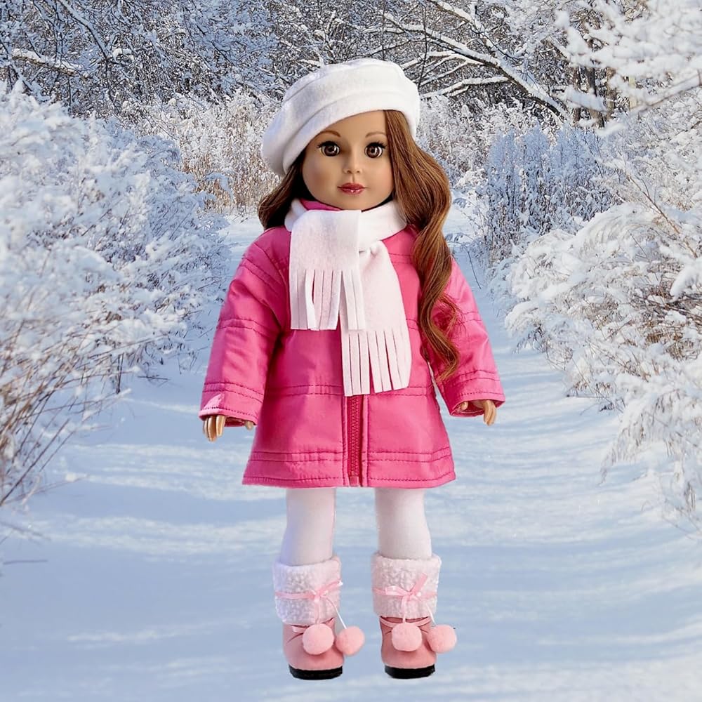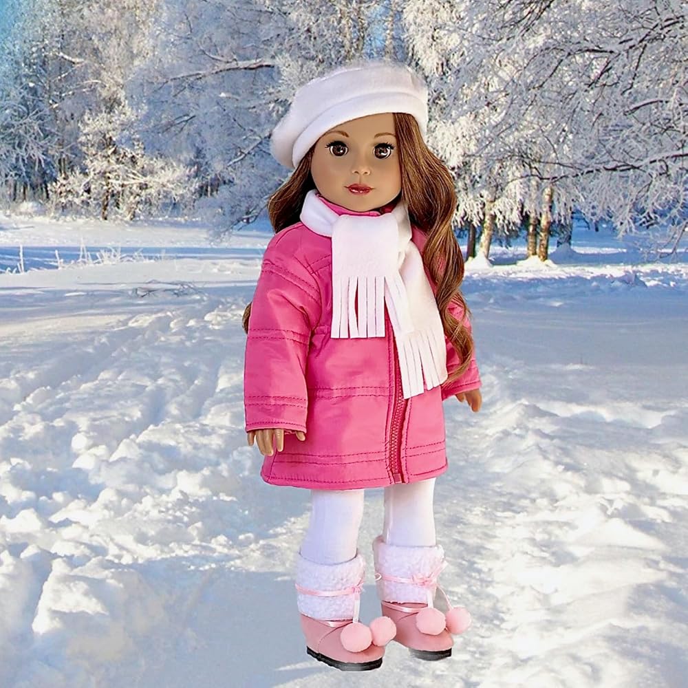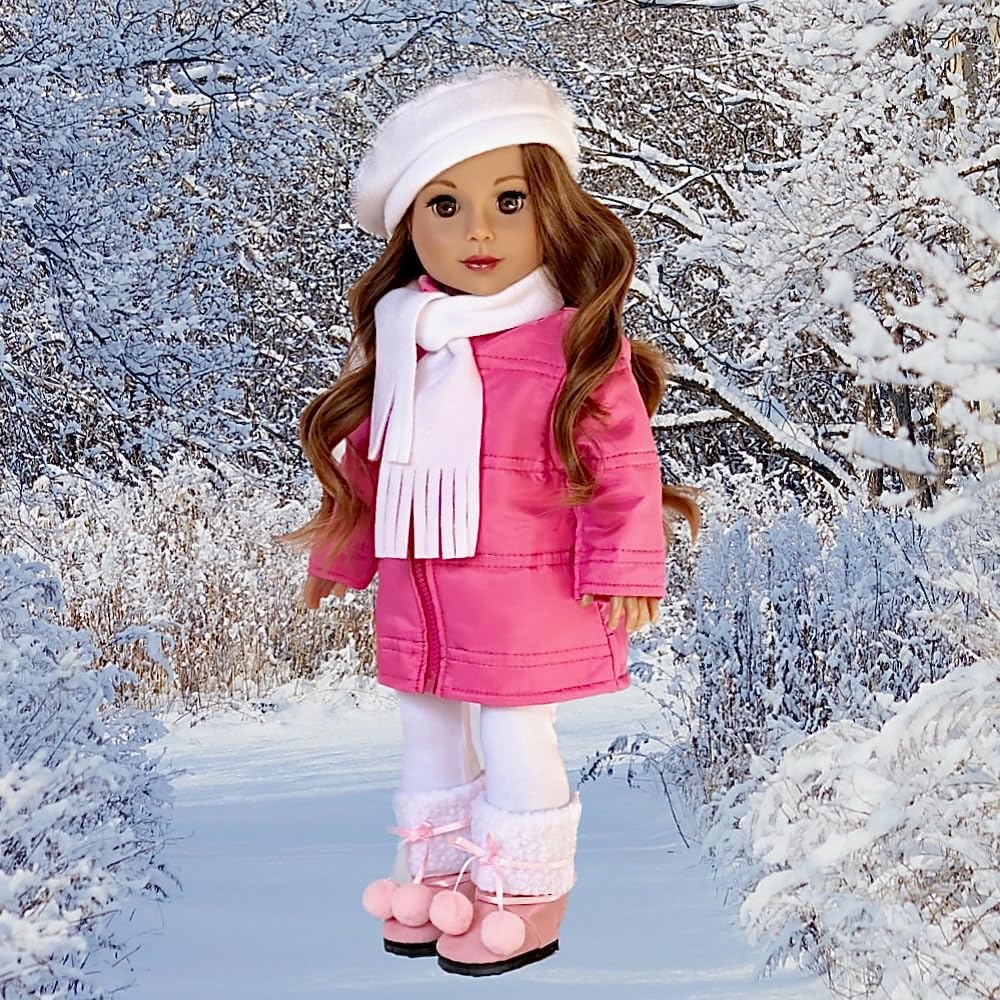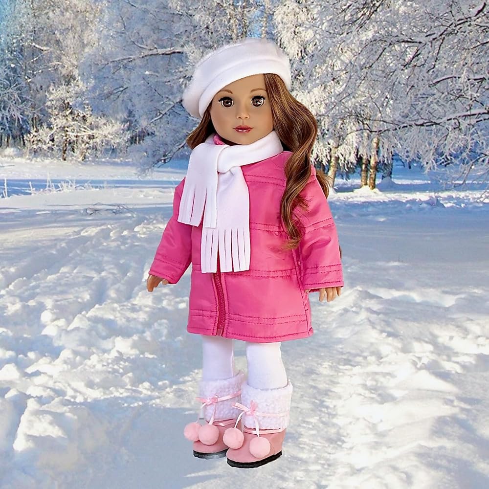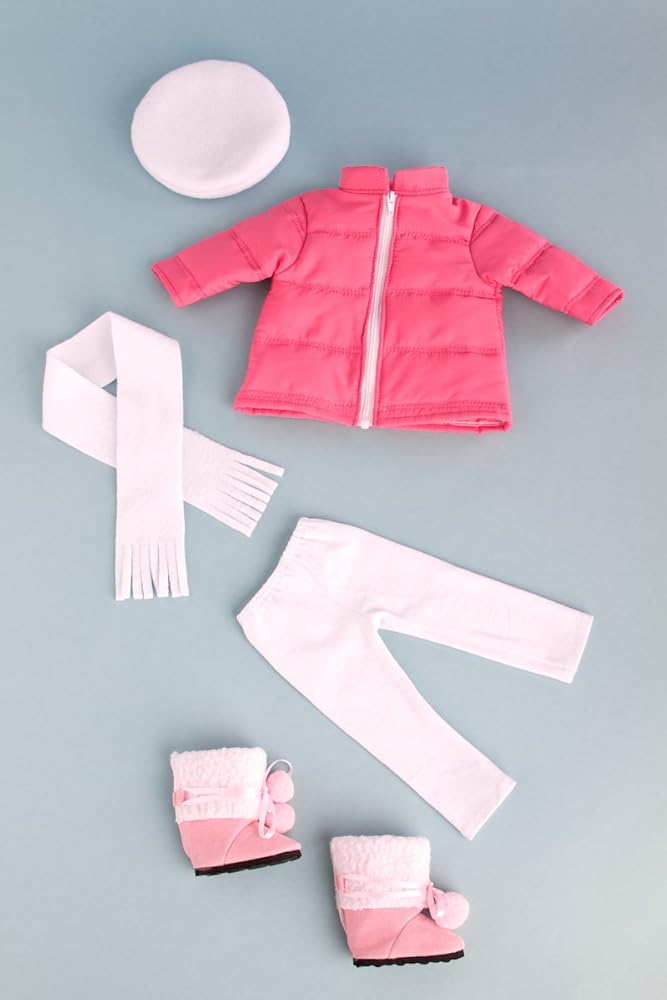 - المغامرة الباريسية - زي مكون من 5 قطع - معطف وردي، وقبعة بيضاء، ووشاح، وسراويل ضيقة، وأحذية وردية - ملابس تناسب دمية مقاس 18 بوصة (الدمية غير متضمنة)