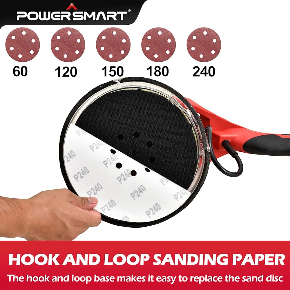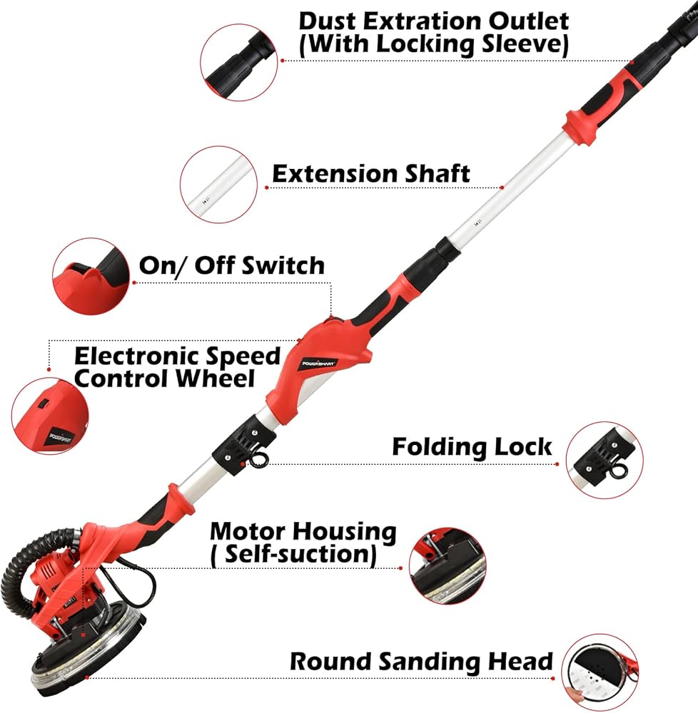 ماكينة صنفرة الحوائط الجافة PowerSmart، ماكينة سنفرة الحوائط الجافة الكهربائية بقدرة 1020 وات 8.5 أمبير مع مجموعة غبار أوتوماتيكية، سرعة قابلة للتعديل 600-2600 دورة في الدقيقة، ضوء LED، مقبض قابل للتمديد والطي، 5 أقراص سنفرة، كيس غبار