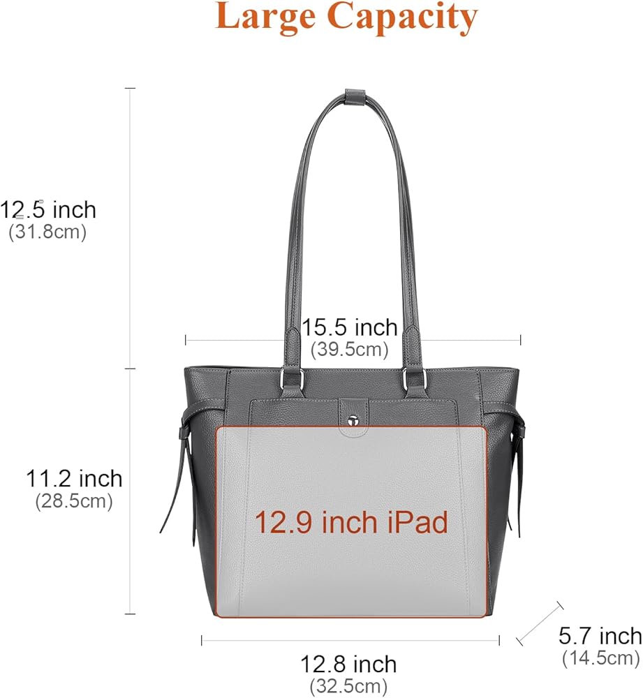 الحجم والوزن: 15.5 (الطول العلوي) × 12.8 (الطول السفلي) × 5.5 (العرض) × 11.2 (الارتفاع) بوصة. ارتفاع المقبض: 12 بوصة. حزام طويل قابل للتعديل من 47 إلى 53 بوصة. وزن حقيبة الكمبيوتر المحمول الجلدية 1.2 كجم/ 2.64 جنيه.