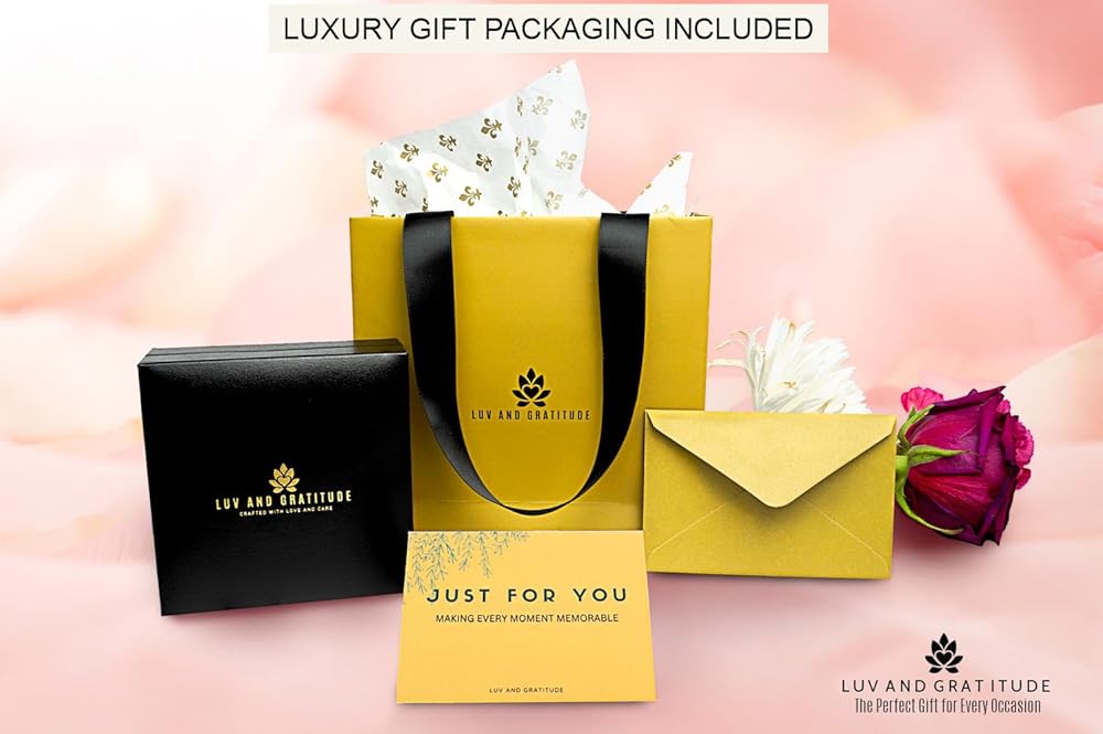 • تغليف فاخر: ستصل قلادتك مع صندوق هدايا المجوهرات الفاخرة الخاص بنا مع بطاقة رسالة مطابقة، وحقيبة هدايا، وورق مناديل وبطاقة هدايا حيث يمكنك كتابة رسالتك الشخصية لها.