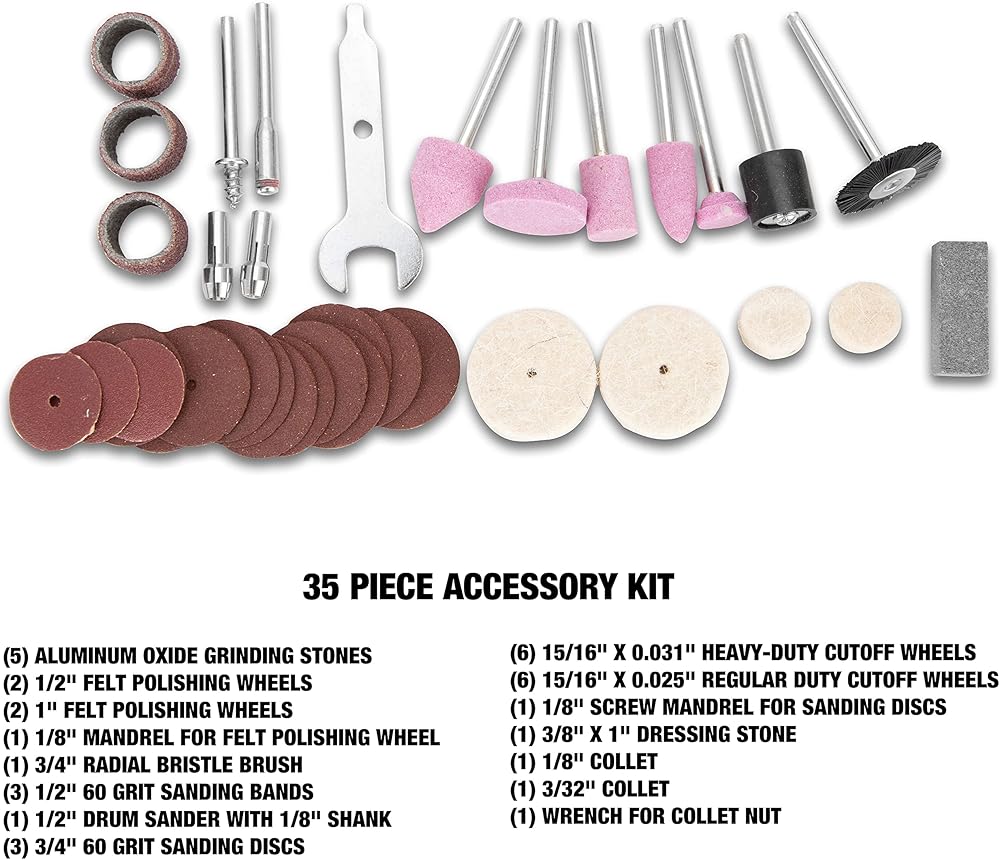 مجموعة متعددة الاستخدامات: 35 قطعة أدوات دوارة تسمح لهذه الأداة الدوارة بالتكيف مع أي مشروع وتشكيل العديد من المواد؛ سعة الطية 1/8 - 3/32 بوصة تناسب معظم أجزاء العلامات التجارية