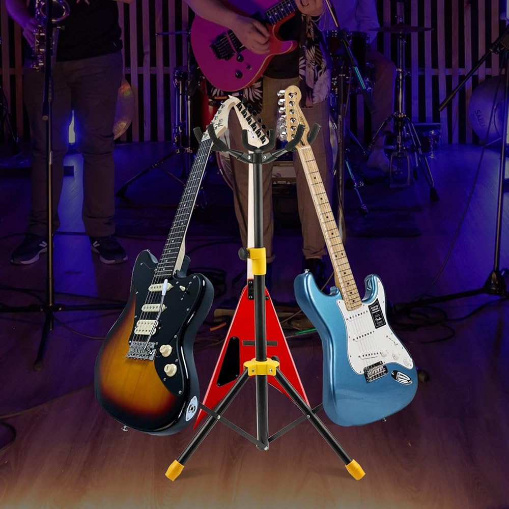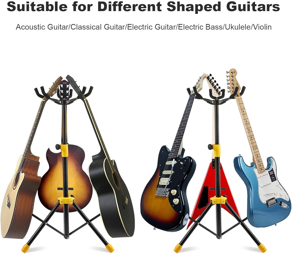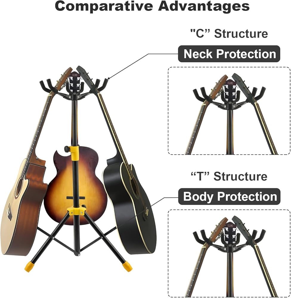 【حامل جيتار ثلاثي】تم تصميم حوامل الجيتار لتعليق معظم الجيتارات والجيتار من خلال غراب الرأس، بينما يقوم المصد الخلفي بوضع الجسم. يحمل 3 أدوات، للاستخدام المسرحي أو المنزلي