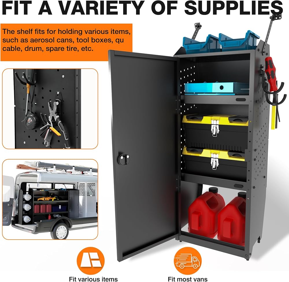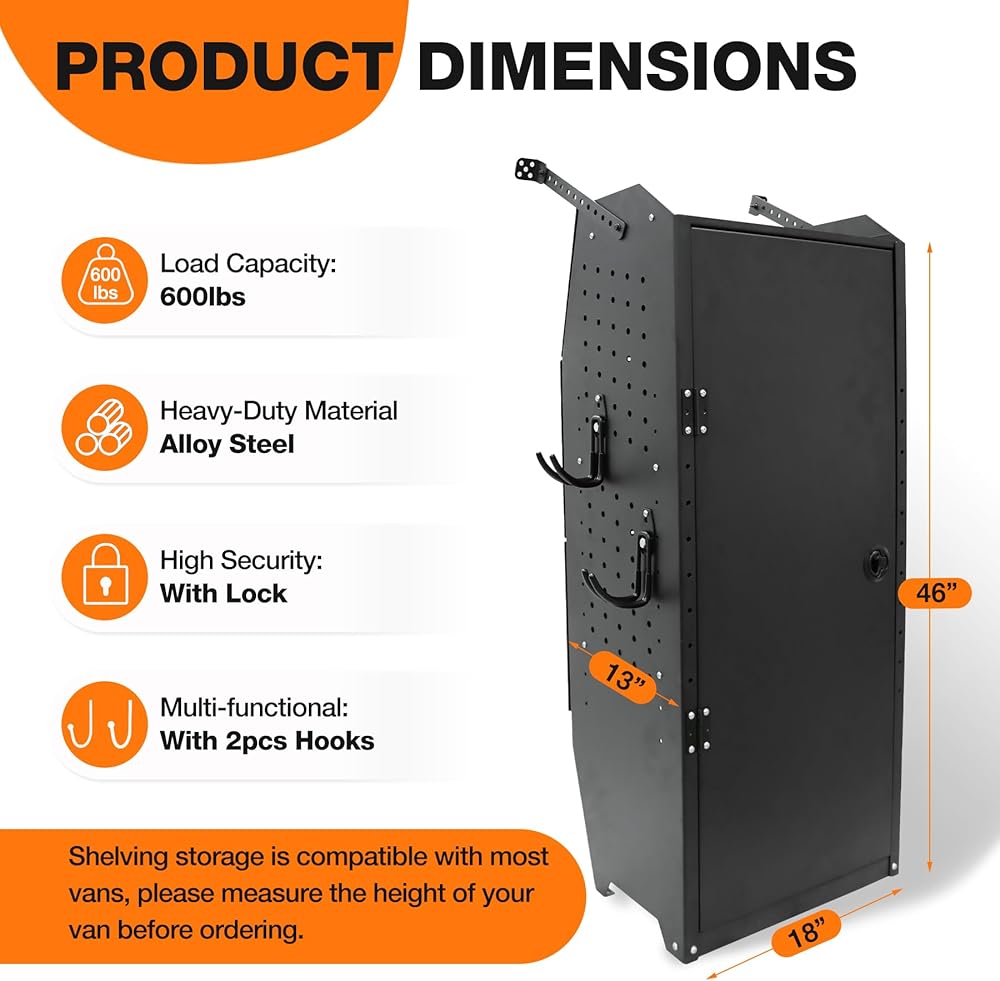 【مناسبة لـ: خزانة تخزين الشاحنة الفولاذية هي 16 بوصة عرض × 46 بوصة ارتفاع × 13 بوصة عمق، تناسب شاحنات البضائع كاملة الحجم، مثل Ford Transit، Connect، E-Series، GMC Savana، Chevy Express، Nissan، GM، ميتريس، بروماستر، سبرينتر، إلخ.