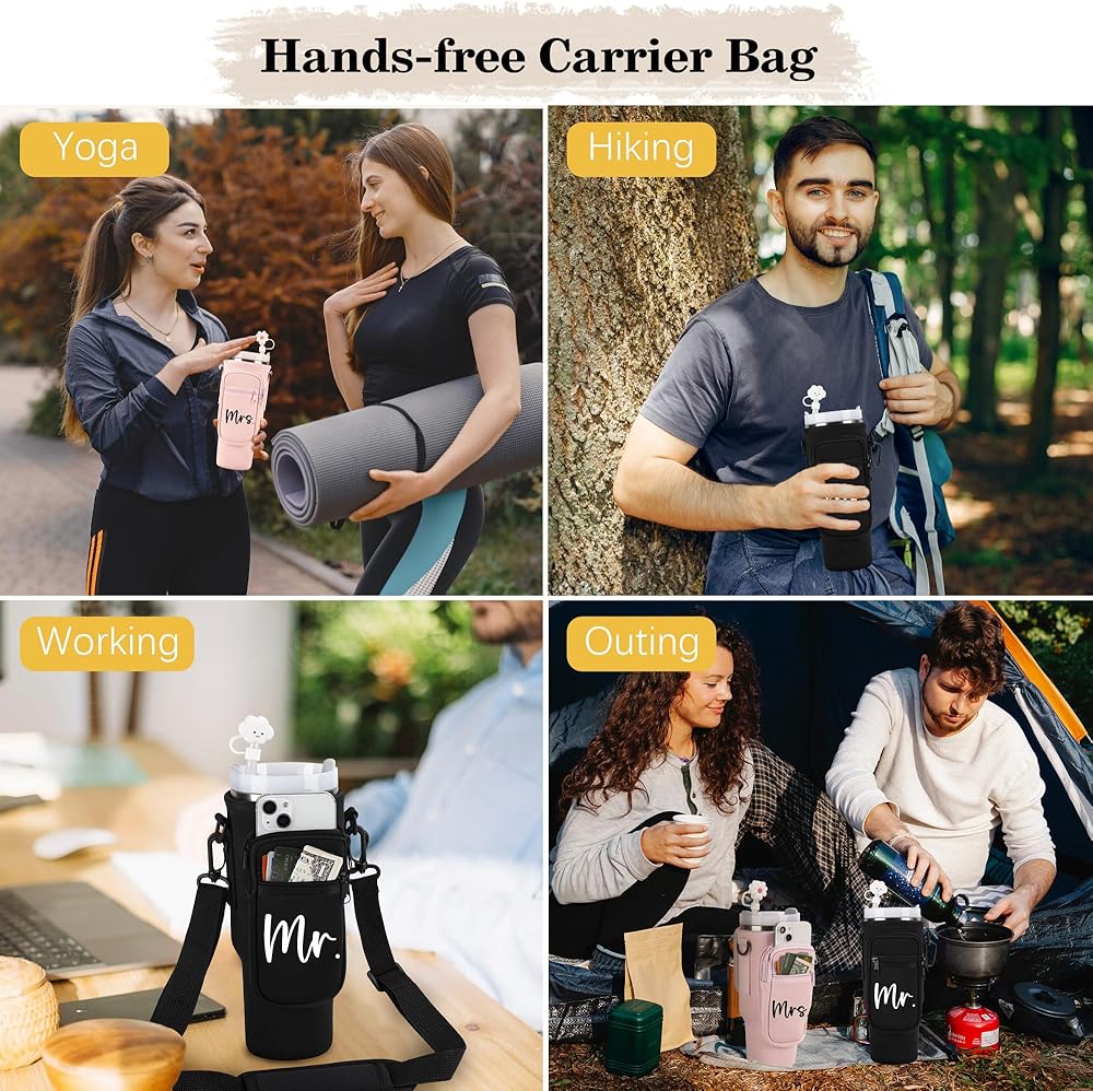 • ✔Personalized Carrier Bag: The Mostop water bottle holder is uniquely adorned with Mr. and Mrs. letters, enhancing the appeal and distinctiveness of your Stanley cup. It's designed specifically for the Stanley Quencher H2.0 40 oz & Adventure Quencher 40oz tumbler, offering a perfect fit, secure grip, and an elegant appearance.