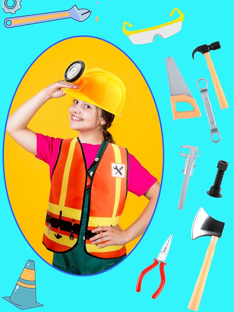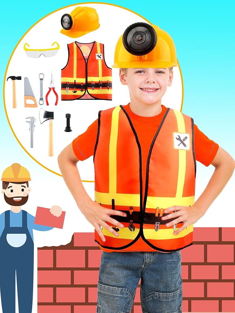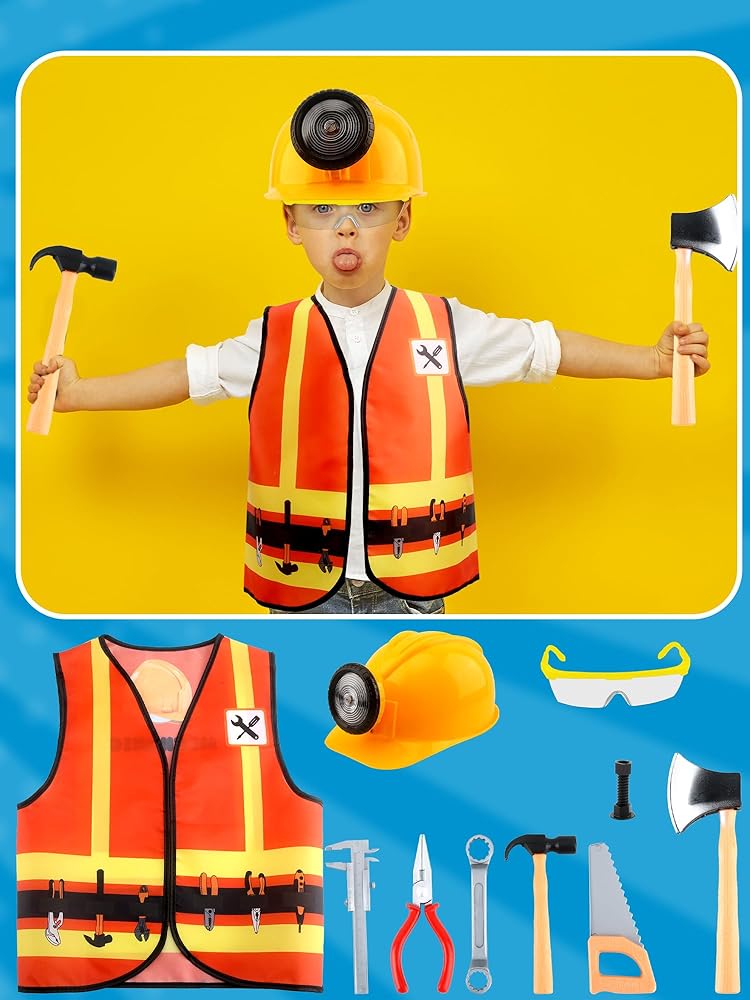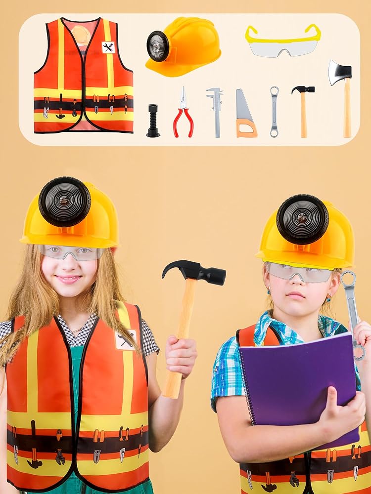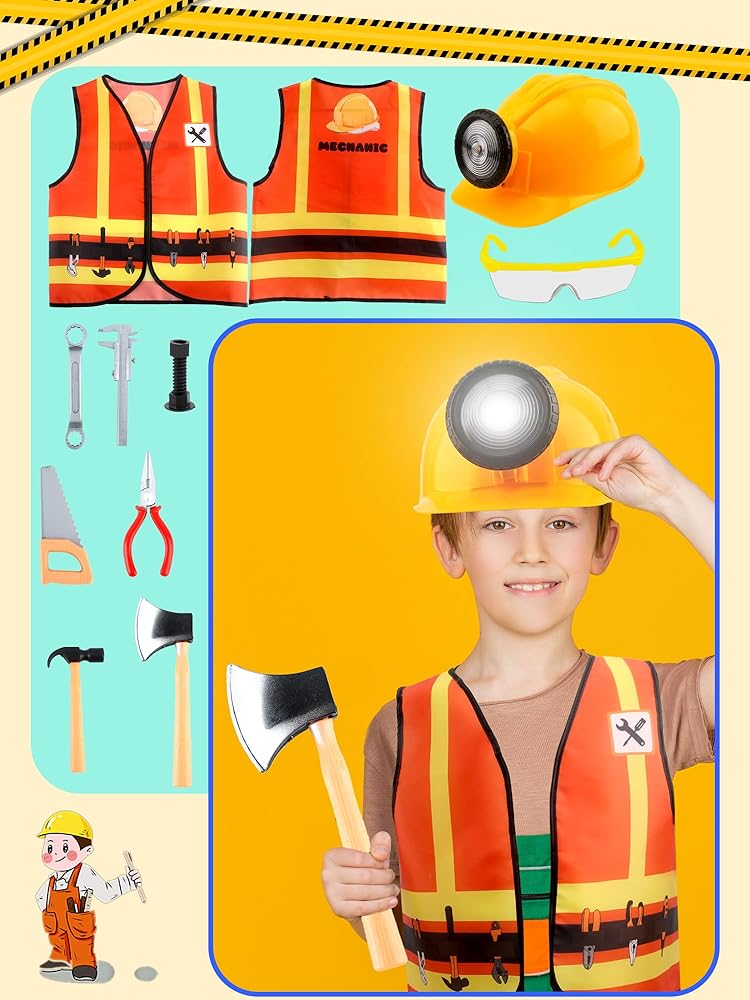Puteraya 10 Pcs Kids Construction Worker Costume Set Construction Vest Hat Goggles and Builder Prop Toys for Birthday Party Dress Up