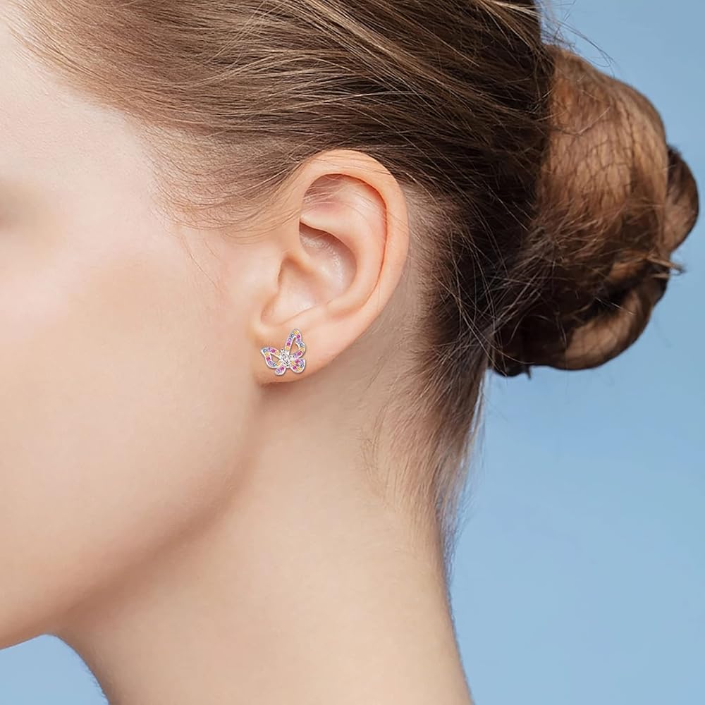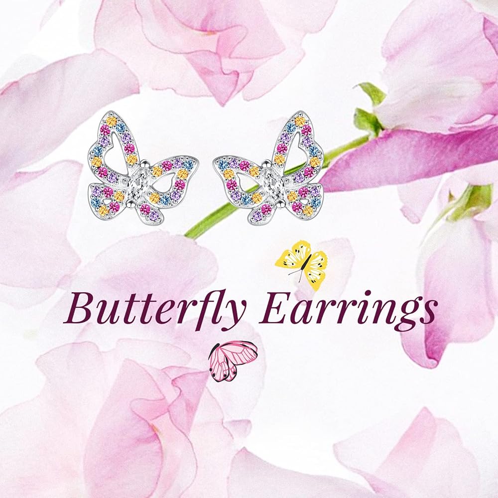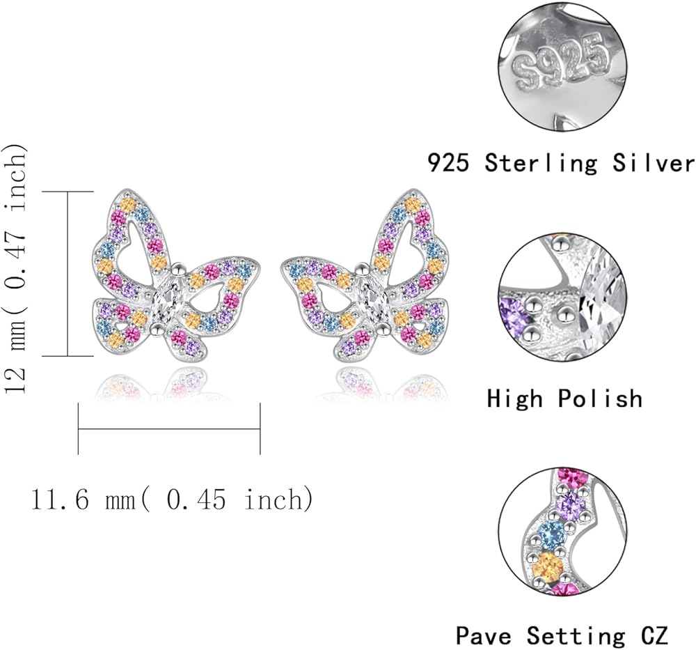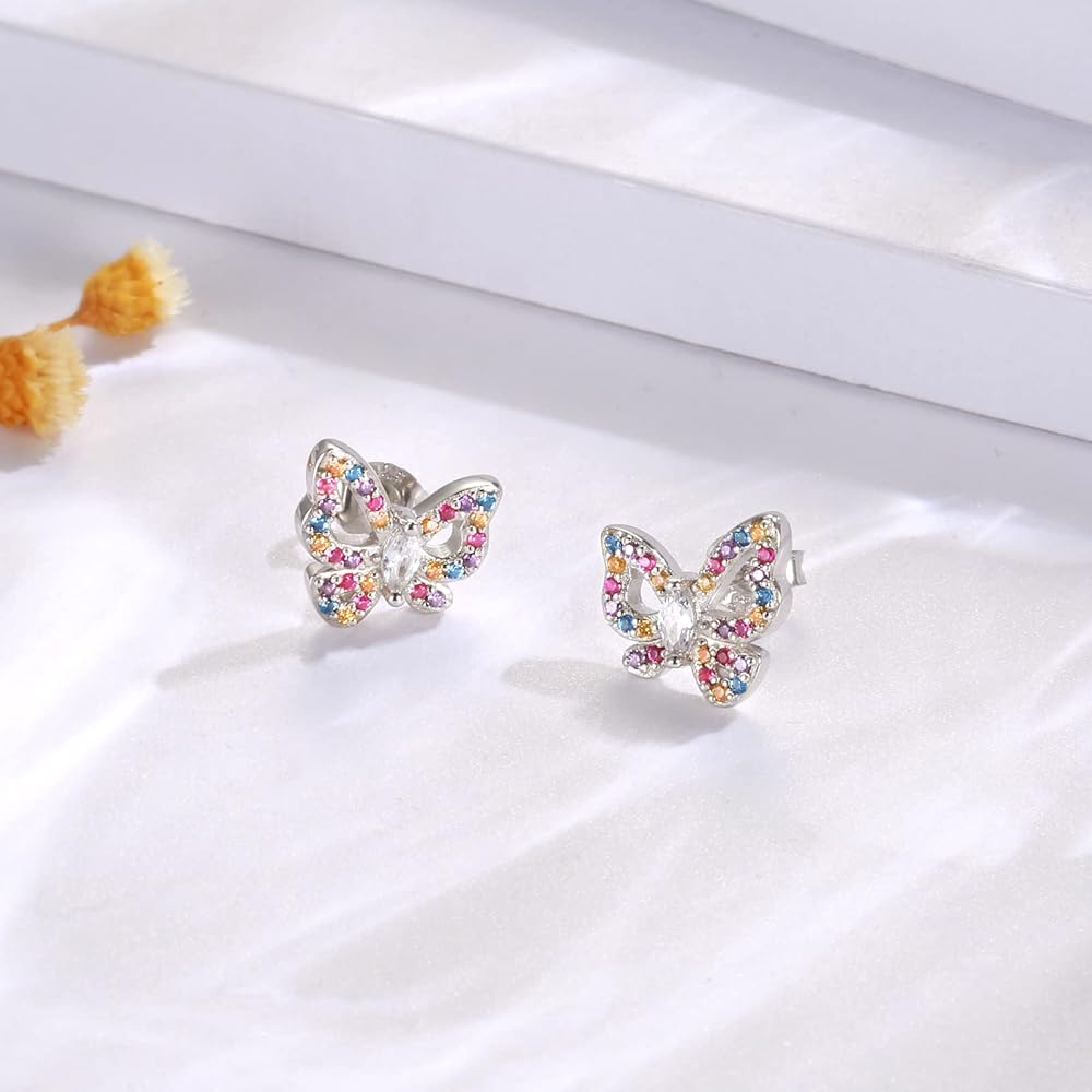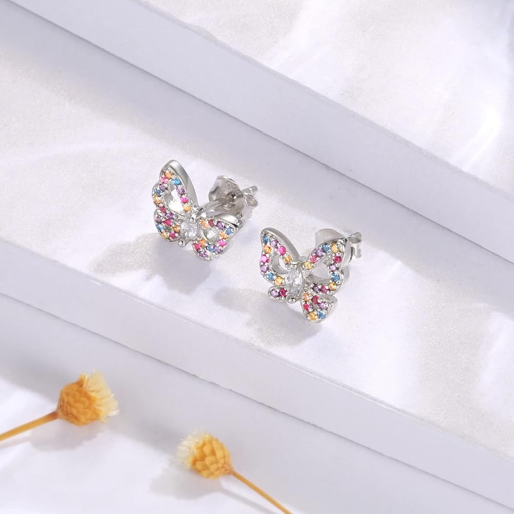 925 Sterling Silver Multicolored Butterfly Earrings - Butterfly Studs Jewelry Cute Colorful Gift for Teens Girls