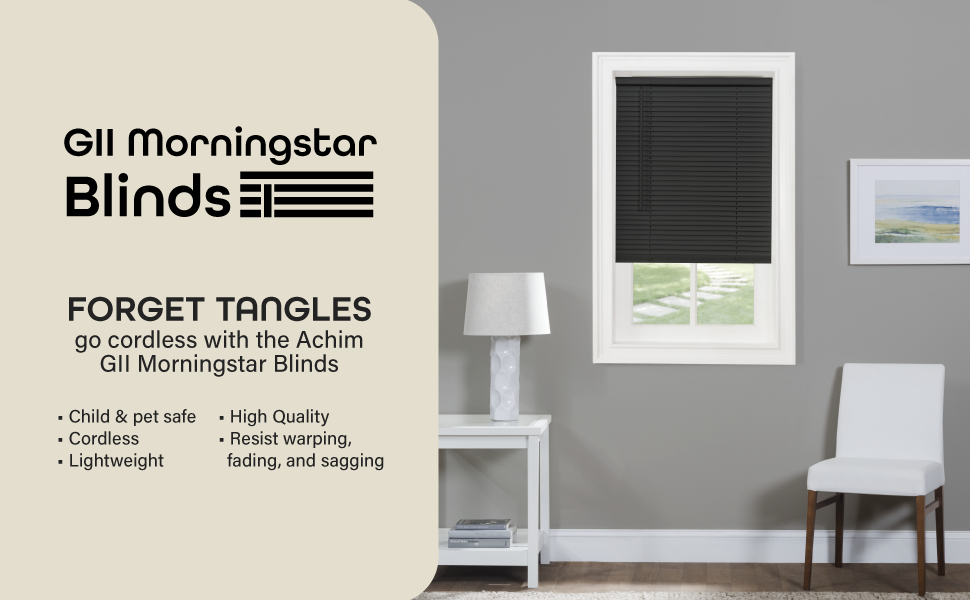 Cordless Blinds: Filter out light with the Achim Cordless Light Filtering Mini Blinds. These lightweight, vinyl blinds with no cords to get tangled are child and pet safe. Durable, high quality construction resists warping, fading, and sagging.