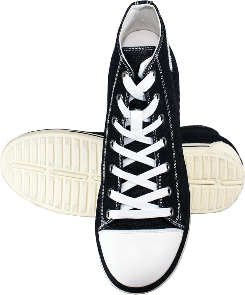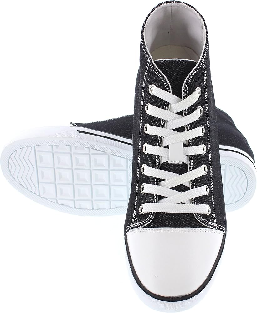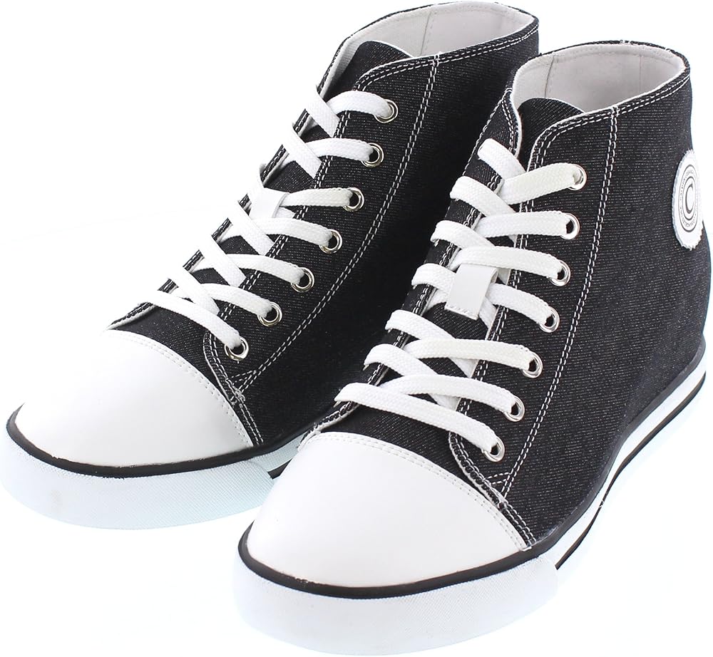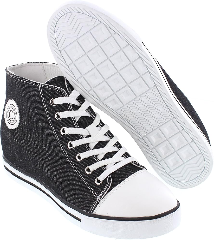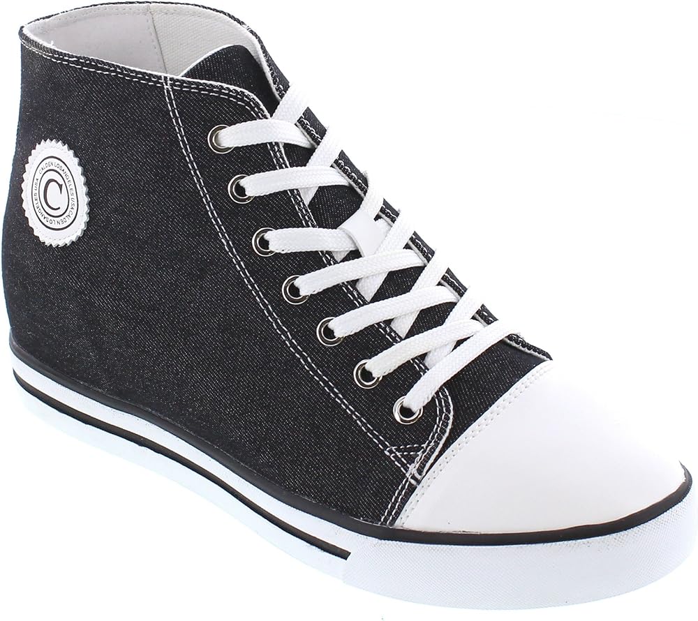 (All sizes listed are US men sizes unless otherwise stated.) Looking for a simple yet classic style to make you tall? The CALDEN - K8828102 - 3 Inches Taller (Black) cap toe elevator high top sneaker with metal eyelet lace up has the most height that you can get without others noticing. This canvas inner lined shoe has a blended seam tracing detailed collar and an added reinforced counter for extra comfort and durability. The hidden insole along with its comfortable traction cement construction sole is made for everyday wear without jeopardizing your comfort.