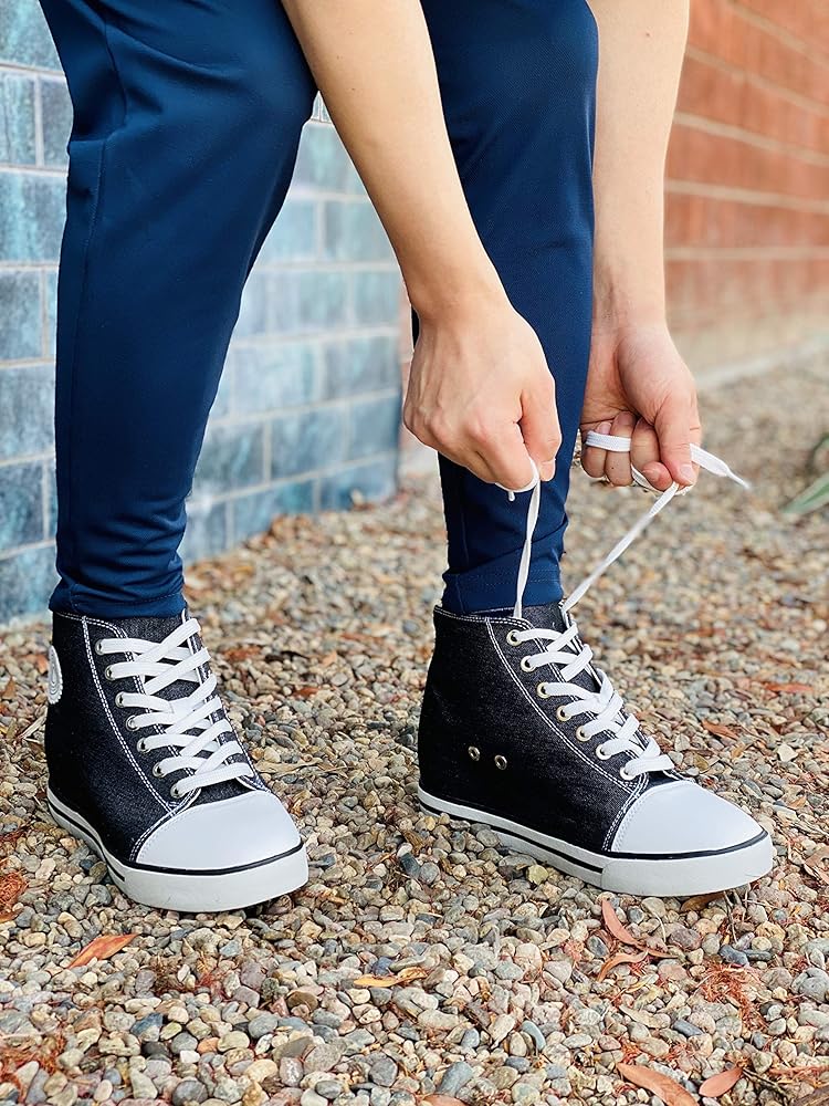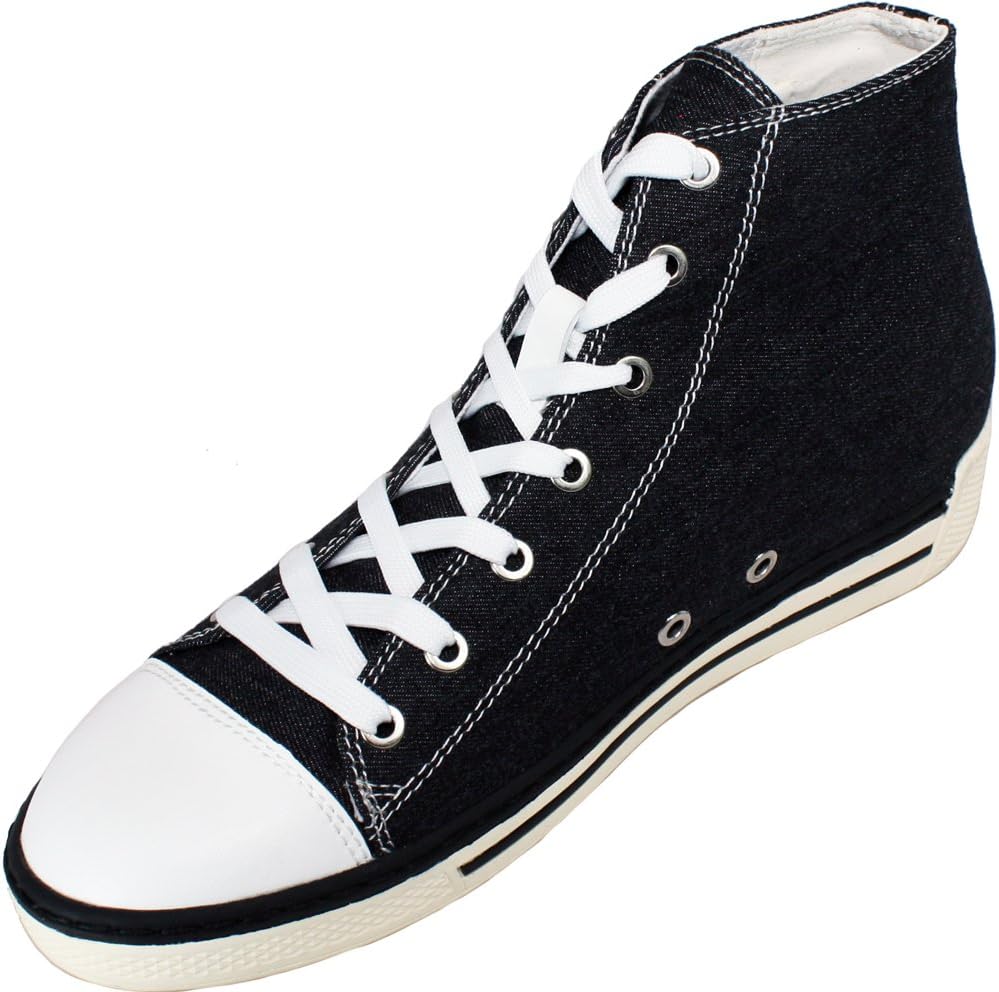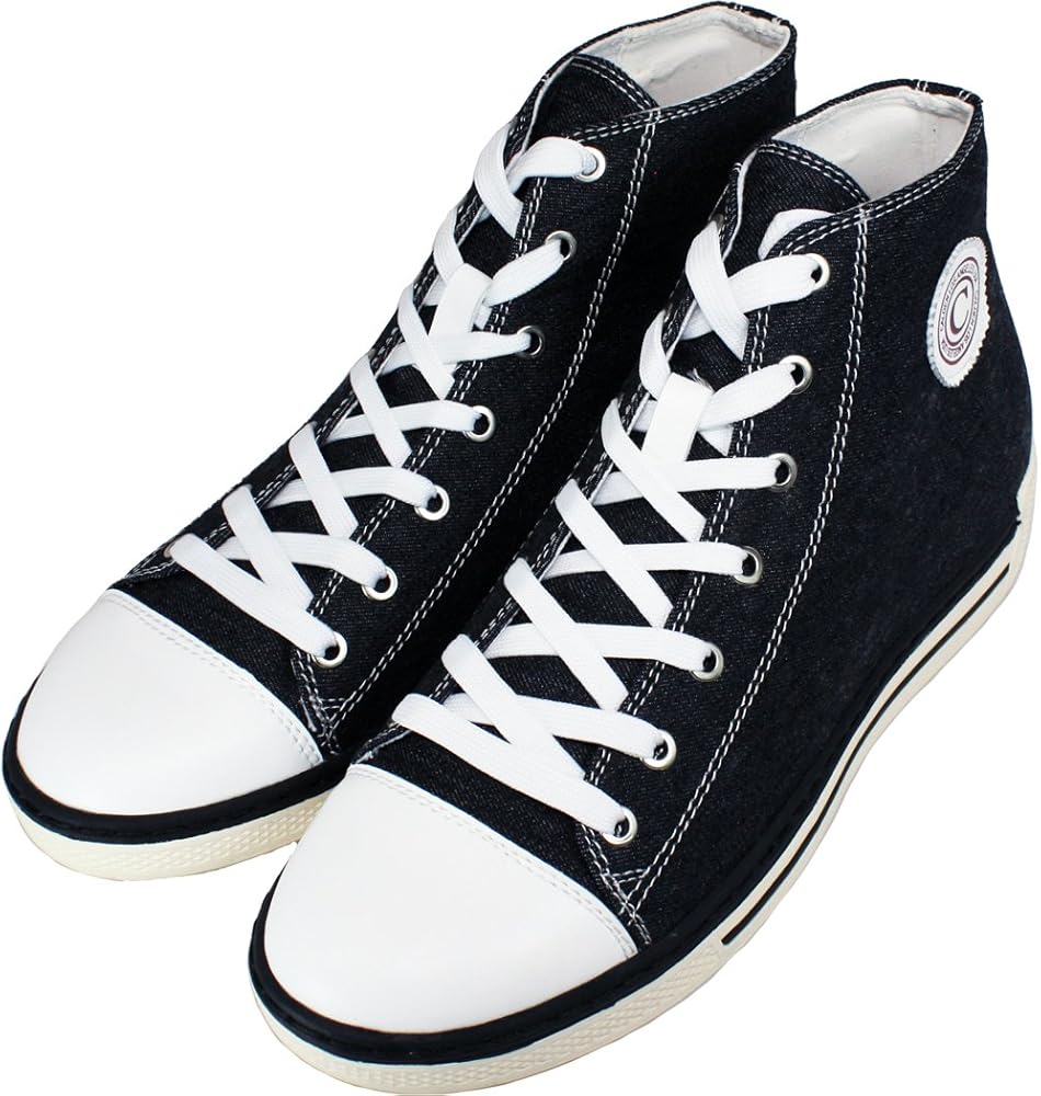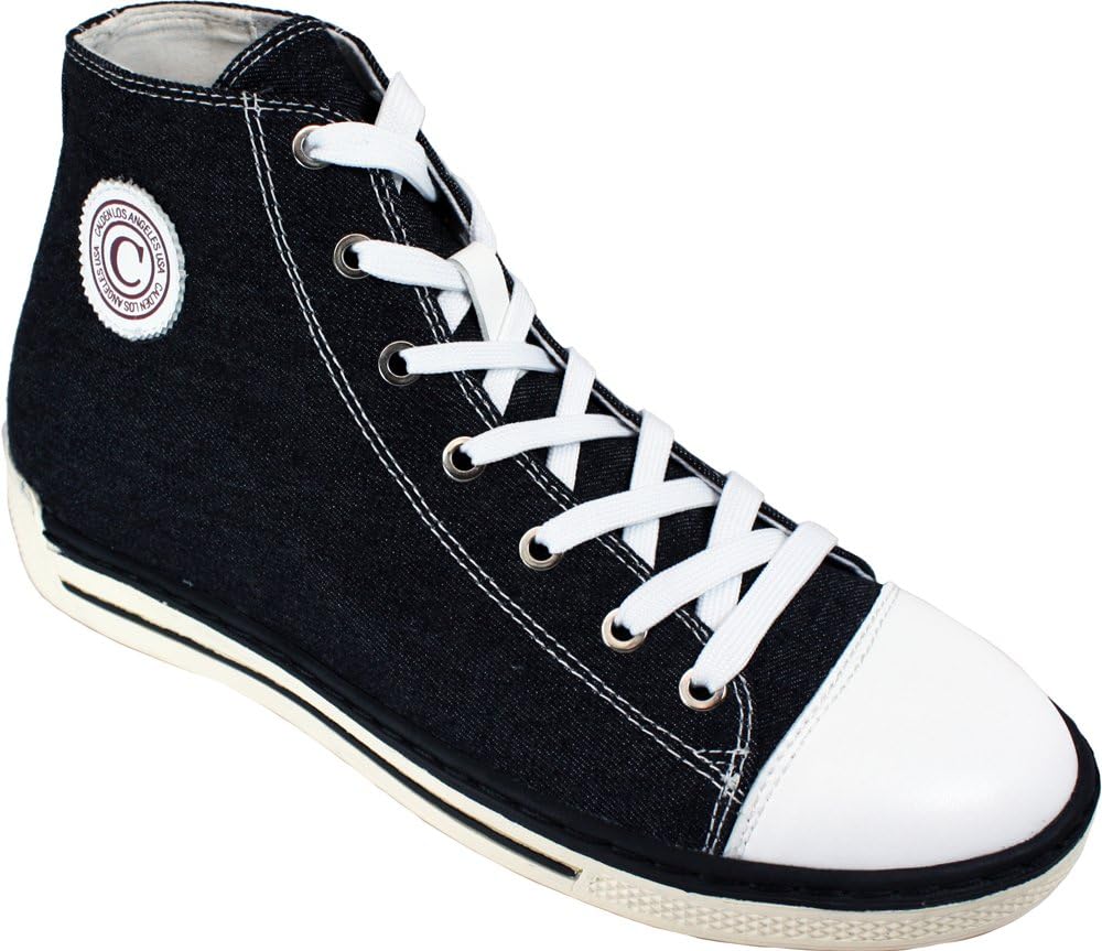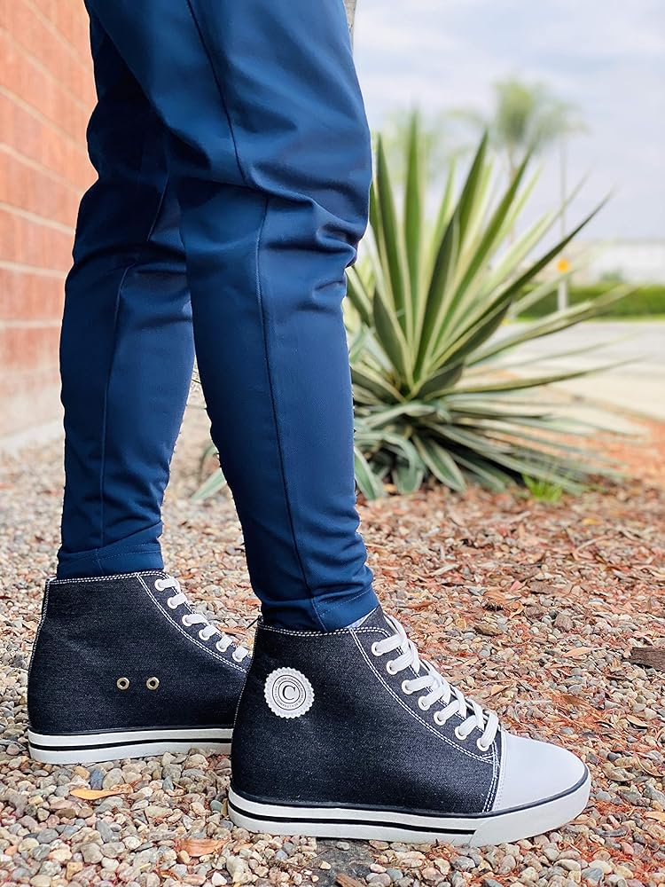 (All sizes listed are US men sizes unless otherwise stated.) Looking for a simple yet classic style to make you tall? The CALDEN - K8828102 - 3 Inches Taller (Black) cap toe elevator high top sneaker with metal eyelet lace up has the most height that you can get without others noticing. This canvas inner lined shoe has a blended seam tracing detailed collar and an added reinforced counter for extra comfort and durability. The hidden insole along with its comfortable traction cement construction sole is made for everyday wear without jeopardizing your comfort.