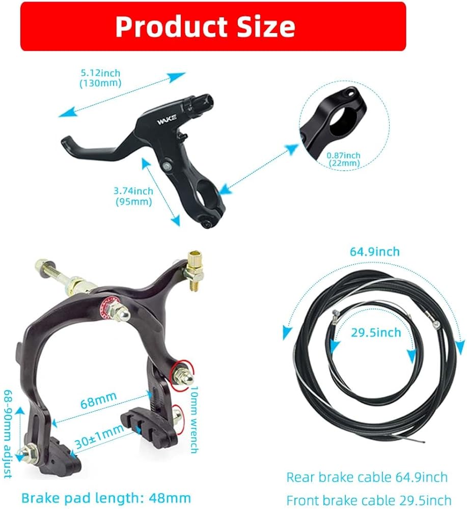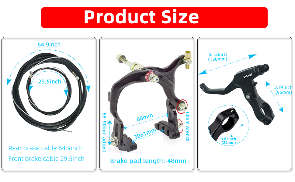 Product size: Front brake cable length: 75cm/29.5"; Rear brake cable length: 165cm/64.9". Brake pad length: 48mm, Height of break pad adjustable 22mm (68-90mm). Aluminum Alloy Brake Lever is suitable for handlebars with a diameter of 2.2 cm/ 0.87 inches, which can be applied to most bikes