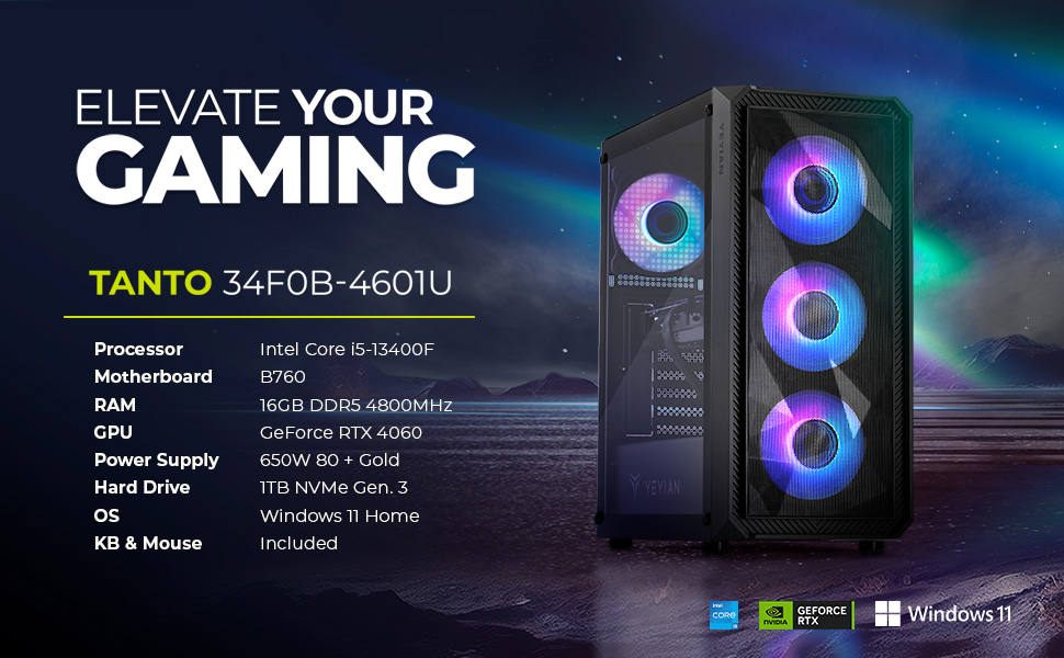 كمبيوتر ألعاب YEYIAN Tanto - Intel الجيل الثالث عشر i5 13400F 2.50 جيجاهرتز، كمبيوتر مكتبي GeForce RTX 4060 8 جيجابايت، 1 تيرابايت NVMe SSD، 16 جيجابايت DDR5 4800 RAM، 650 وات PSU، Intel B760، Win 11 Home Prebuilt PC، واي فاي جاهز