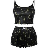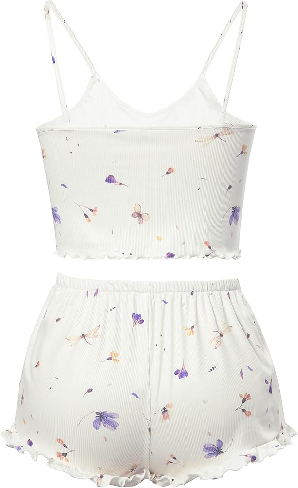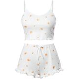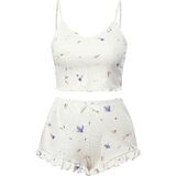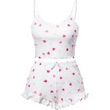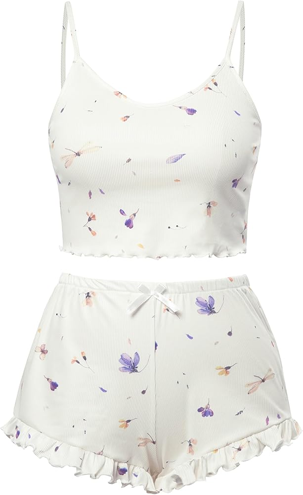 يتميز قميص البيجامة الناعم هذا برقبة واسعة، وبدون أكمام، وجزء علوي قصير، وحزام سباغيتي، وطباعة لطيفة، وزخرفة من الخس، وسروال بيجامة مريح مصمم بخصر مرن، ورباط، وطول الفخذ.