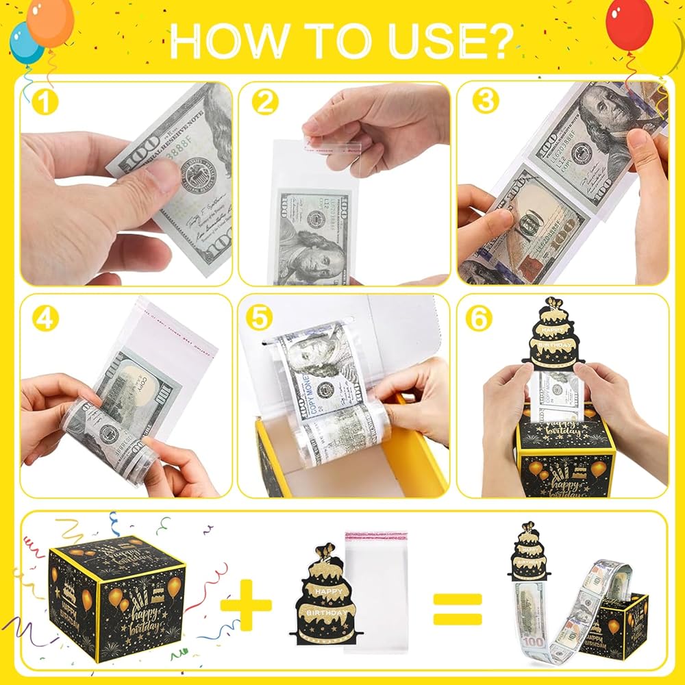 【How to Use】- First Put money into the bags, stick the bags together, please paste each bag tightly, then roll up the money bags, put money bags into the box, or you can put the money box in the cake,You can enjoy the birthday surprise.