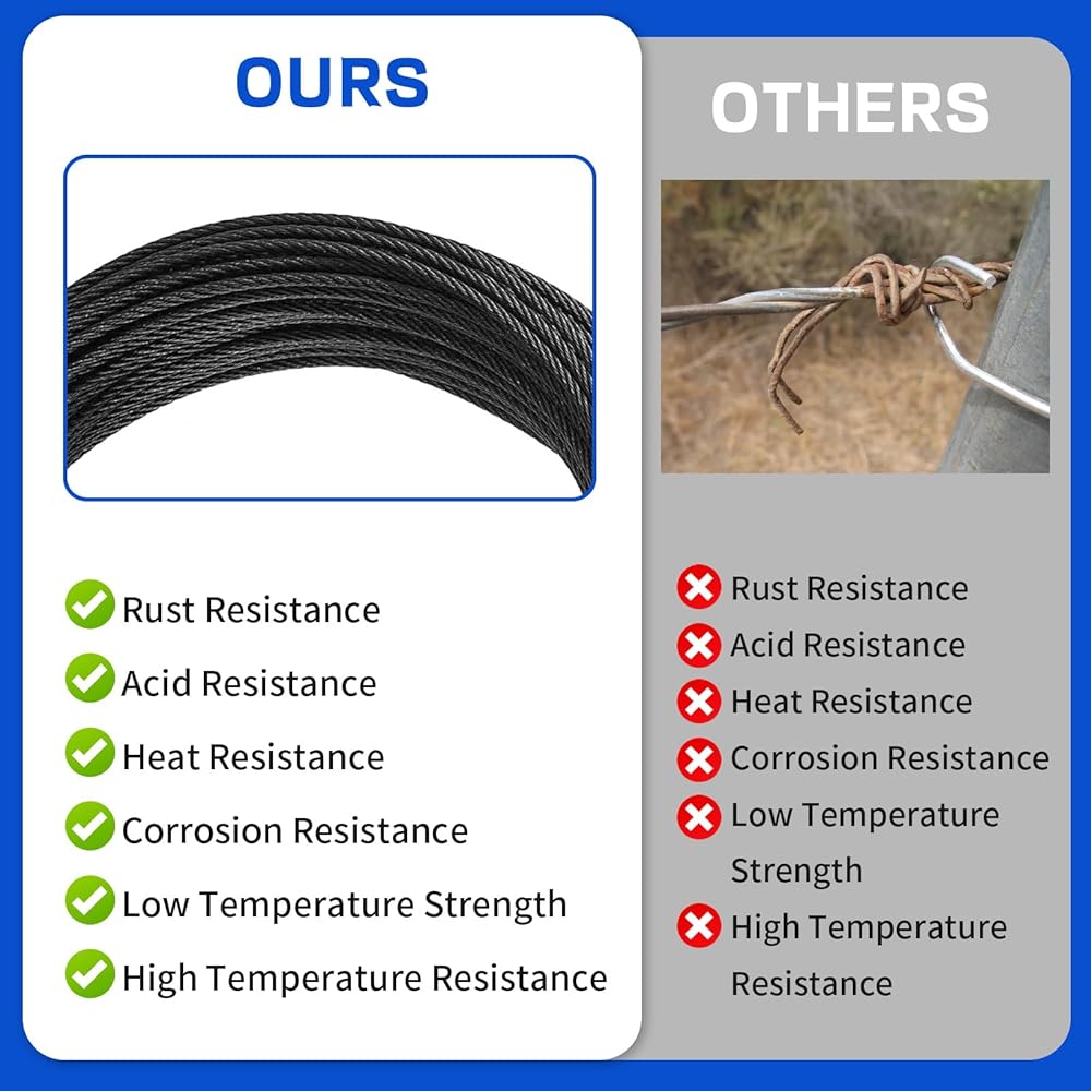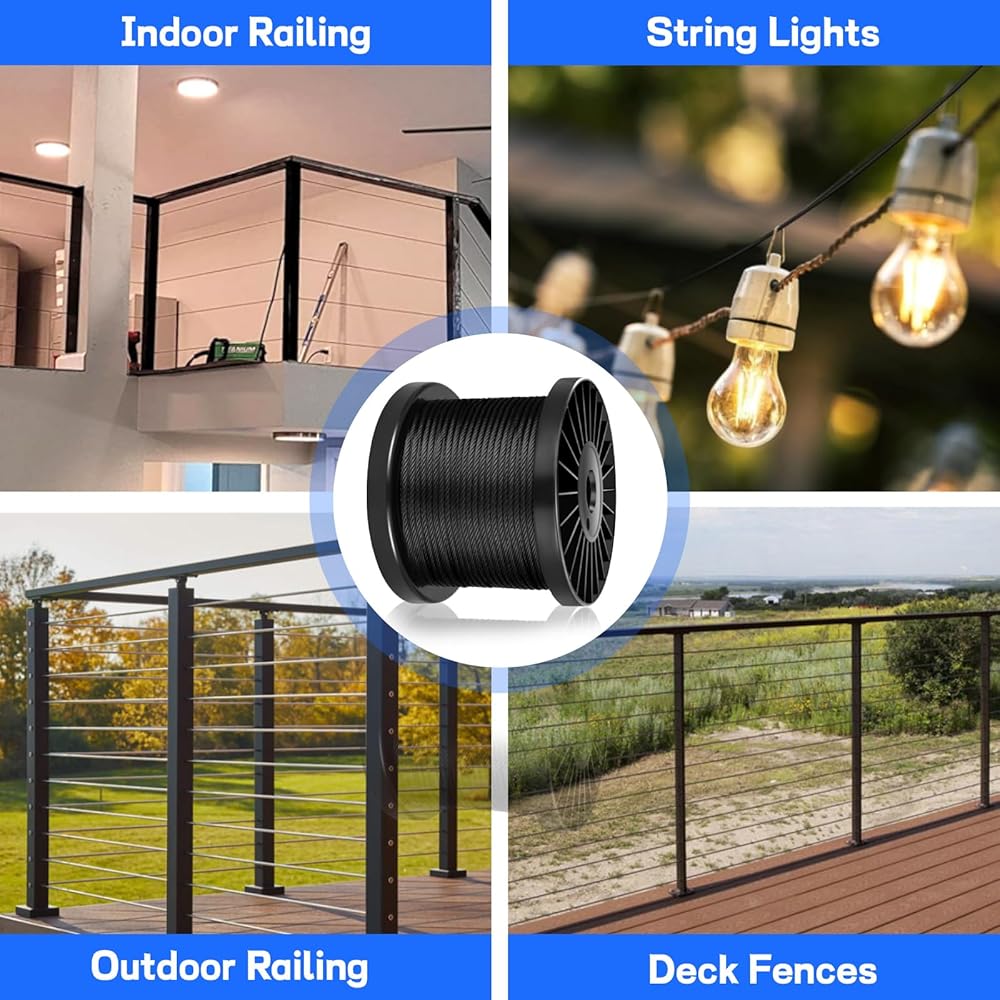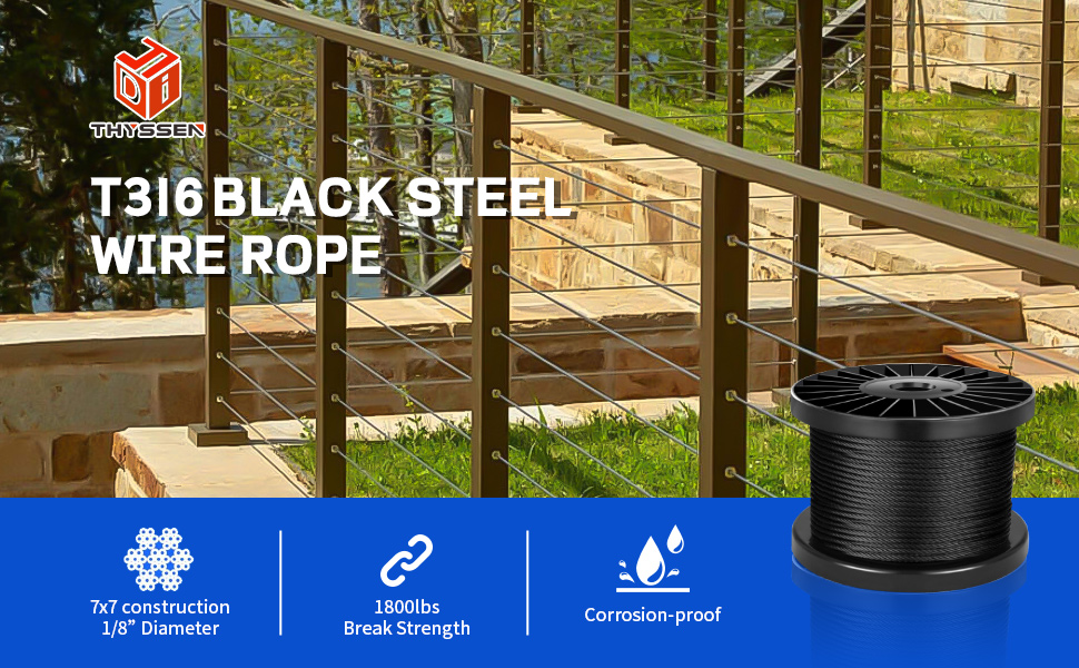 THYSSEN 500FT T316 1/8 "كابل أسود من الفولاذ المقاوم للصدأ 7 × 7 خيوط بناء مقاوم للاهتراء، مضاد للأكسدة مناسب للدرابزين، سطح السفينة، أجهزة درابزين الكابلات، كابل سلك حبل الطائرة للتعليق