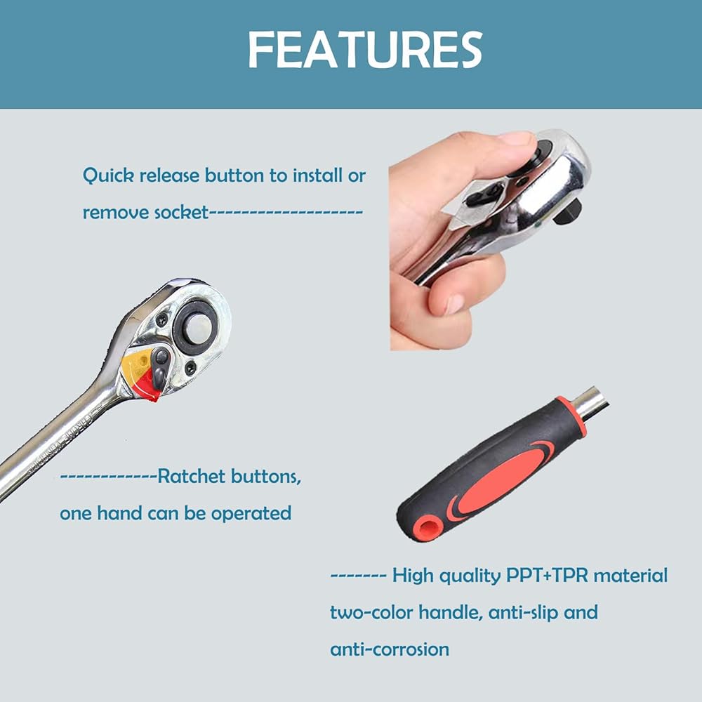 PROFESSIONAL RATCHET HANDLE: Ergonomic easy-grip ratcheting handle could be quickly released, make you comfortably reverse the switch and let the product exceptional durability