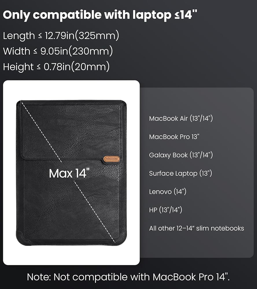 【Compatibility】- Internal dimensions:325*230*20mm (L x W x H); External dimensions: 352*253*22.4mm (L x W x H); Please check your laptop's size.Design for laptops from 13~14 inch.such as Apple MacBook 12 / 13, MacBook Air 13, MacBook Pro 13 ,Microsoft Surface Book 2 Surface Laptop 3, ThinkPad, Dell Inspiron XPS, HP, ASUS, Chromebook, and other 13''~14'' notebooks.