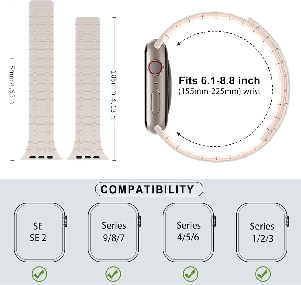 ✅النماذج والمقاسات المتوافقة: سوار ساعة Amizee المغناطيسي من السيليكون متوافق مع 42 مم 44 مم 45 مم 49 مم Ultra/Ultra 2، السلسلة 9، السلسلة 8، السلسلة 7، SE، السلسلة 6، السلسلة 5، السلسلة 4، السلسلة 3، السلسلة 2، السلسلة 1 يناسب معصم 6.89-9.84 بوصة (175 مللي متر-250 مللي متر). ملحوظة: يرجى التأكد من المقاس عن طريق التحقق من المقاس الموجود على الجزء الخلفي من الساعة قبل تقديم الطلب.