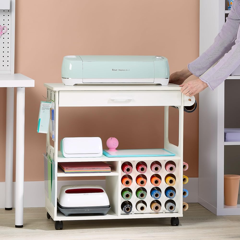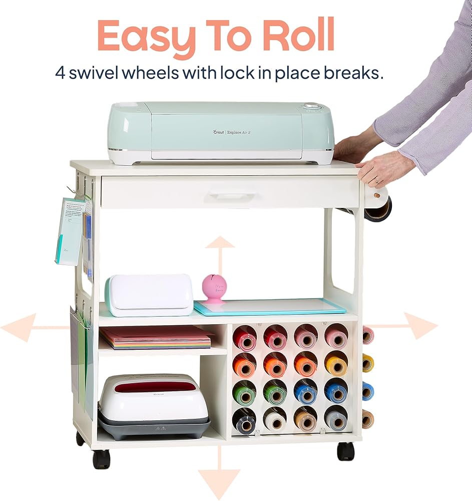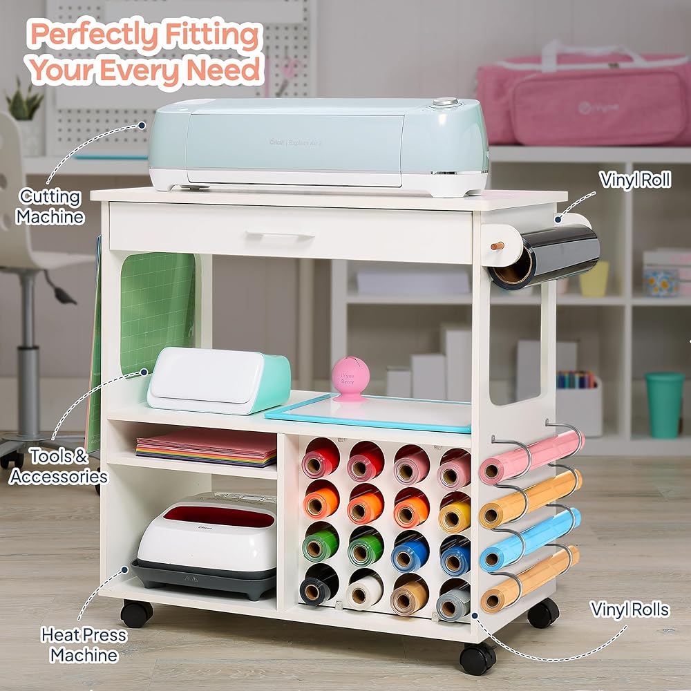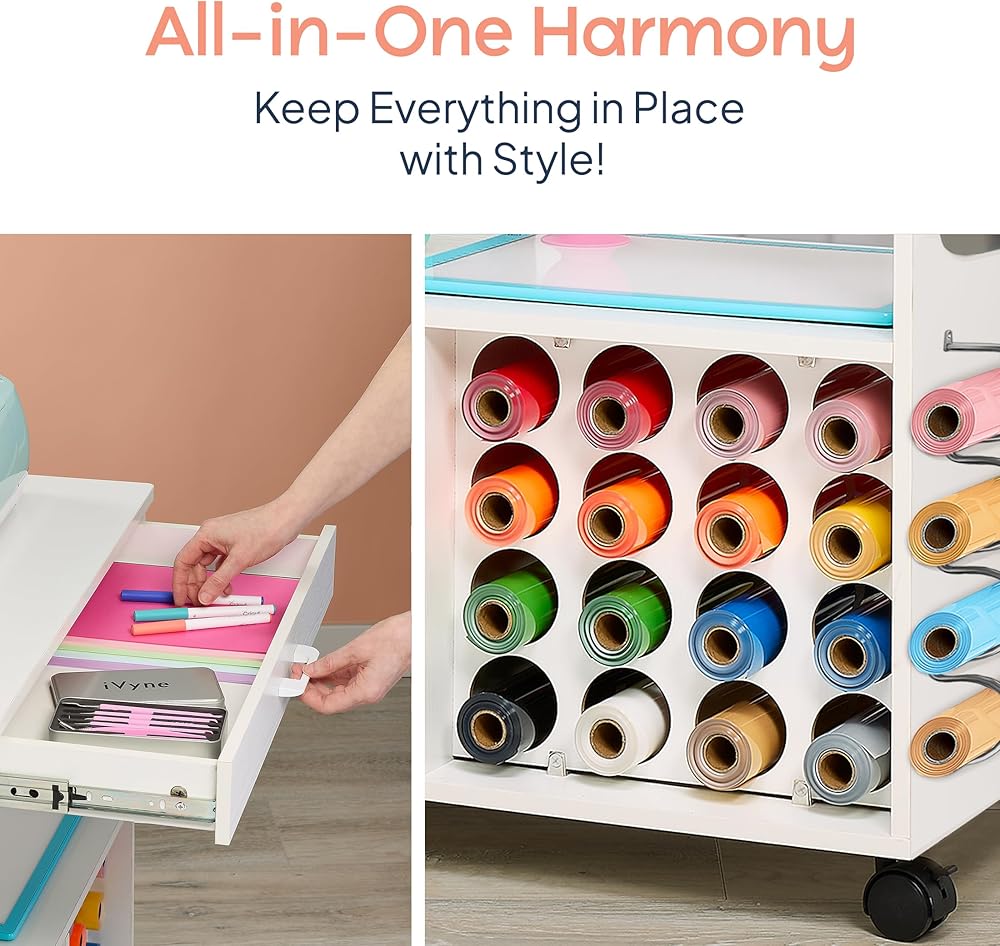 عربة iVyne Craft، طاولة تنظيم وتخزين نهائية للكريكات/الصورة الظلية مع رف معدني، طاولة حرفية مع مساحة تخزين، محطة عمل للملحقات، التوت، لفافات الفينيل، والمزيد - أبيض
