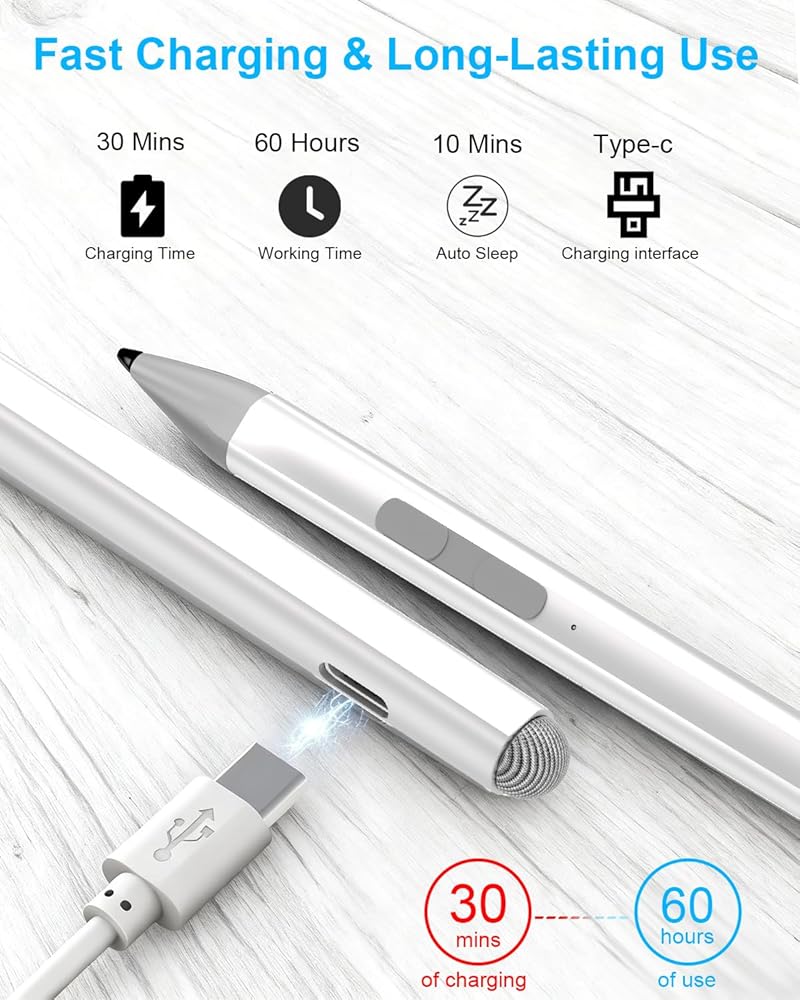 • 🖊عمر بطارية قوي: يقدم قلم Surface تصميم الشحن السريع من النوع C، والذي يمكن أن يوفر ما يصل إلى 60 ساعة من الاستخدام بعد 30 دقيقة فقط من الشحن. بالإضافة إلى ذلك، يتم إيقاف تشغيل القلم تلقائيًا بعد 10 دقائق من عدم النشاط، مما يقلل بشكل كبير من استهلاك البطارية. وهذا يعني أنه يمكن للمستخدمين استخدام القلم لفترة طويلة للإنشاء أو الدراسة أو غيرها من المهام دون الحاجة إلى إعادة الشحن بشكل متكرر، مما يحسن استمرارية العمل والدراسة.