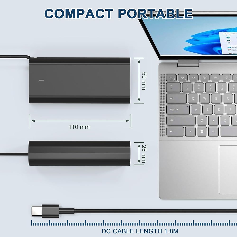 🔌الإدخال: 100-240 فولت، الإخراج: 20 فولت 3.25 أمبير 65 وات، حجم الموصل: USB-C / النوع C (شاحن PD 3.0)