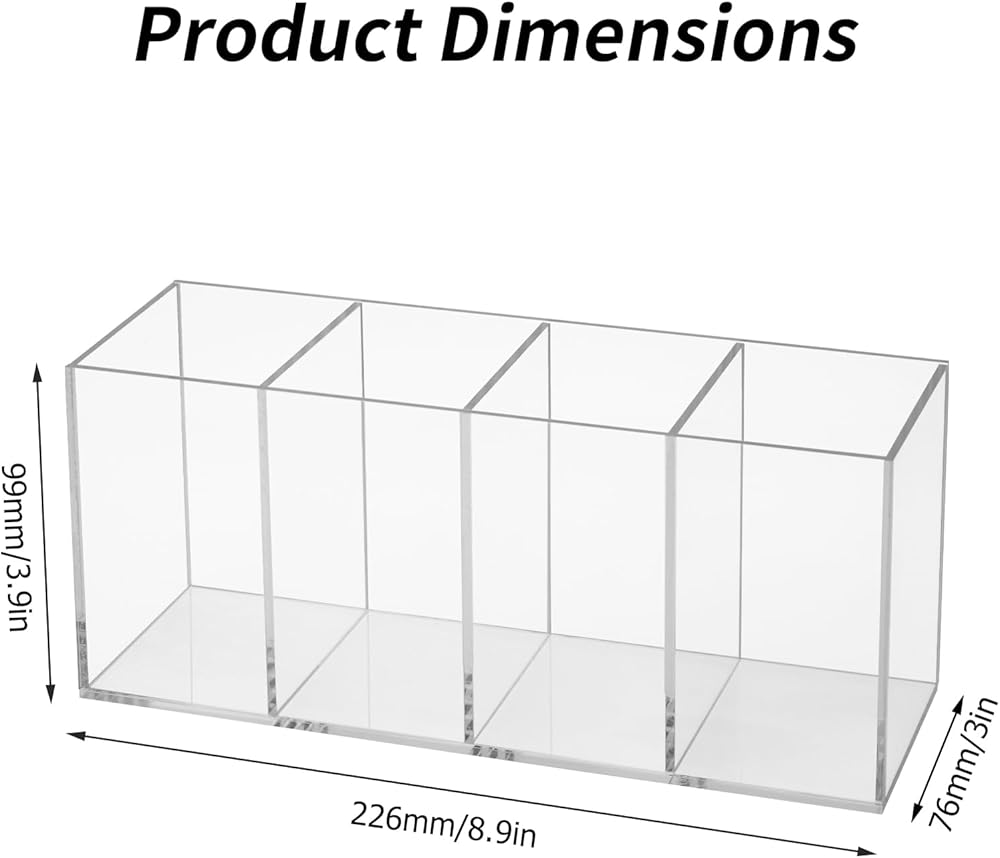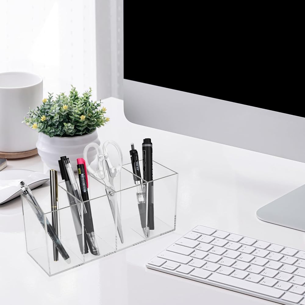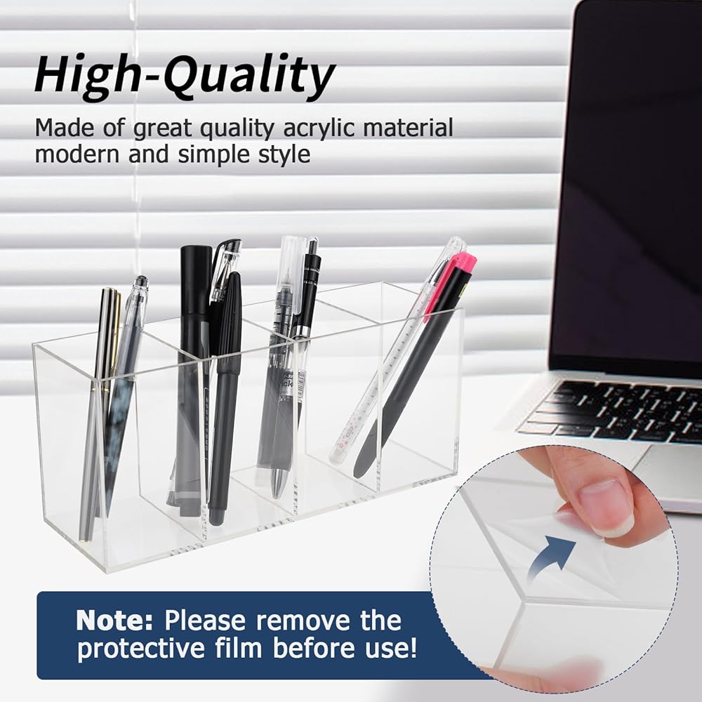【Acrylic Pen Holder 4 Compartments】Clear pen holder has four separate section that allow you hold different type of pens, pencils, markers, highlighters into different compartments. Acrylic pencil holder keeps your desk clean and organized. Note: Please remove protective film before use.