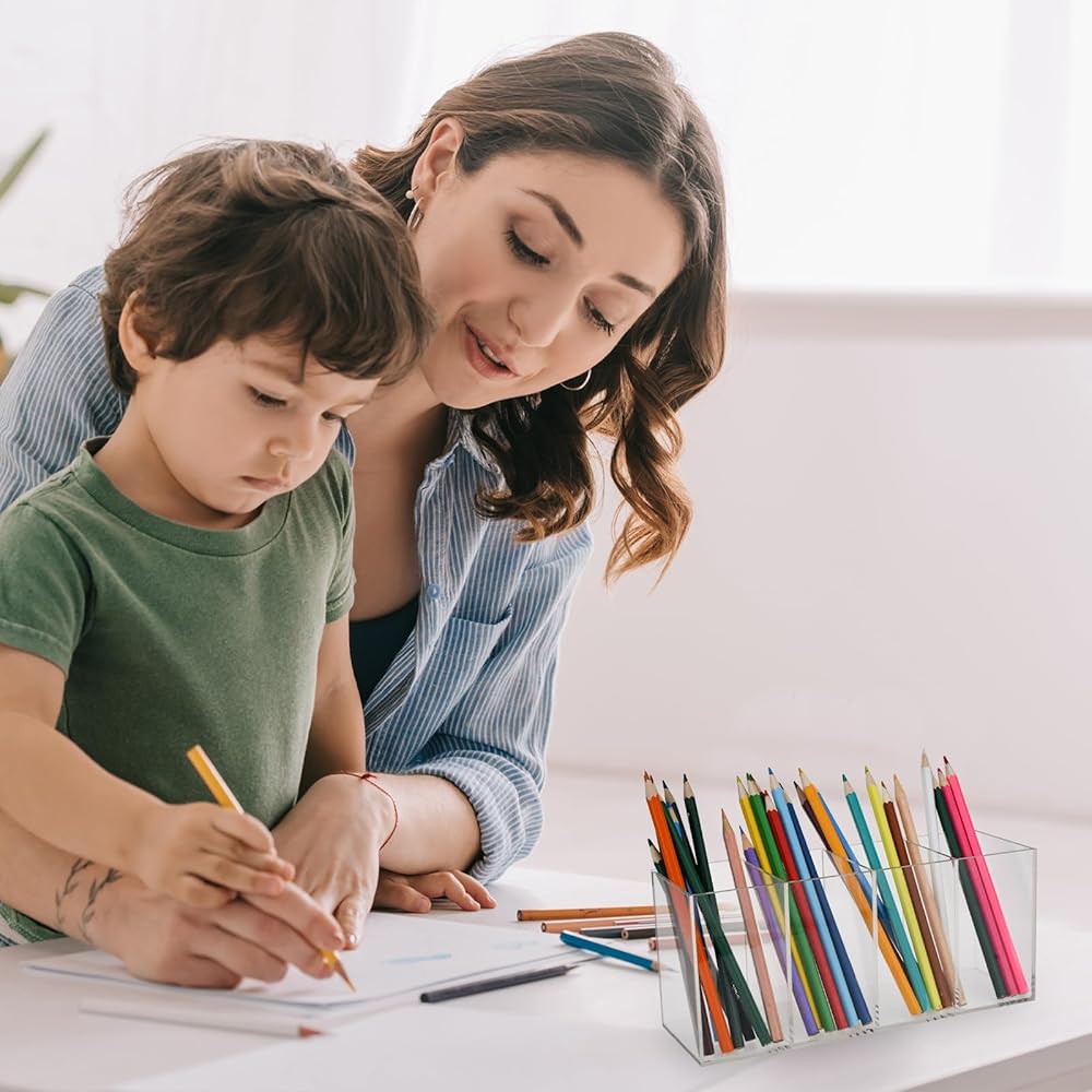 【Large Capacity】Acrylic pen organizer is perfect for holding pens, colored pencils, crayons, markers, highlighters, makeup brushes and other desktop office supplies. Acrylic cup holder has tall sections, which keep your pens upright from sliding out. All pencils are held together in one convenient location!