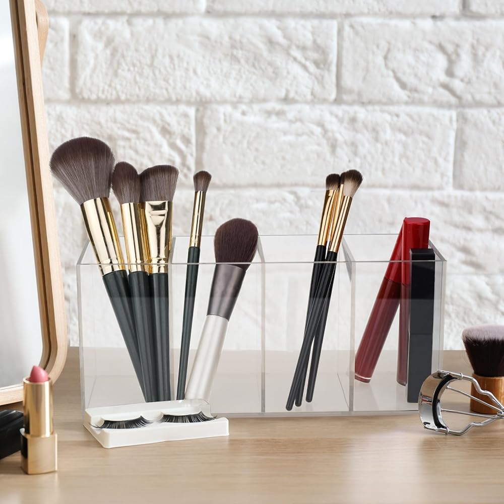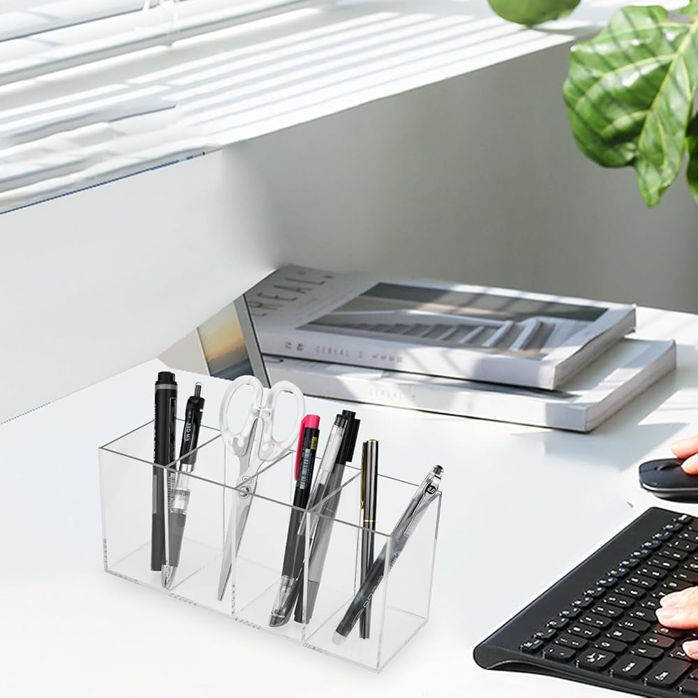 Acrylic Pen Holder, Clear Pen Holder, Acrylic Pencil Organizer Cup Holder 4 Compartments for Desk Countertop Storage, 8.9*3*3.9"