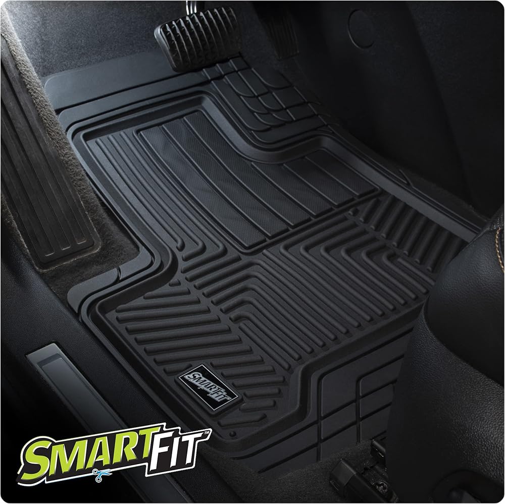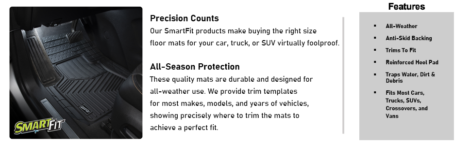 The SmartFit™ 3-Piece Black All-Weather Truck Floor Mats will have you ready to hit the road in three steps: Install, trim, and go. These rubber polymer mats have deeply sculpted channels and a full internal tray designed to trap water, road salt, mud, and sand. This set of floor mats is also engineered to stay flexible in even the coldest of temperatures and features a protective, non-stick finish to make cleanup quick and easy. Patented Carpet Claw™ technology prevents the mats from sliding and shifting. Simply visit the website www.causa/smartfit.com for instructions as well as a diagram of cut lines that are specific to the year, make, and model of your vehicle. Get a perfect custom fit for your ride with SmartFit™ 3-Piece Black All-Weather Truck Floor Mats.