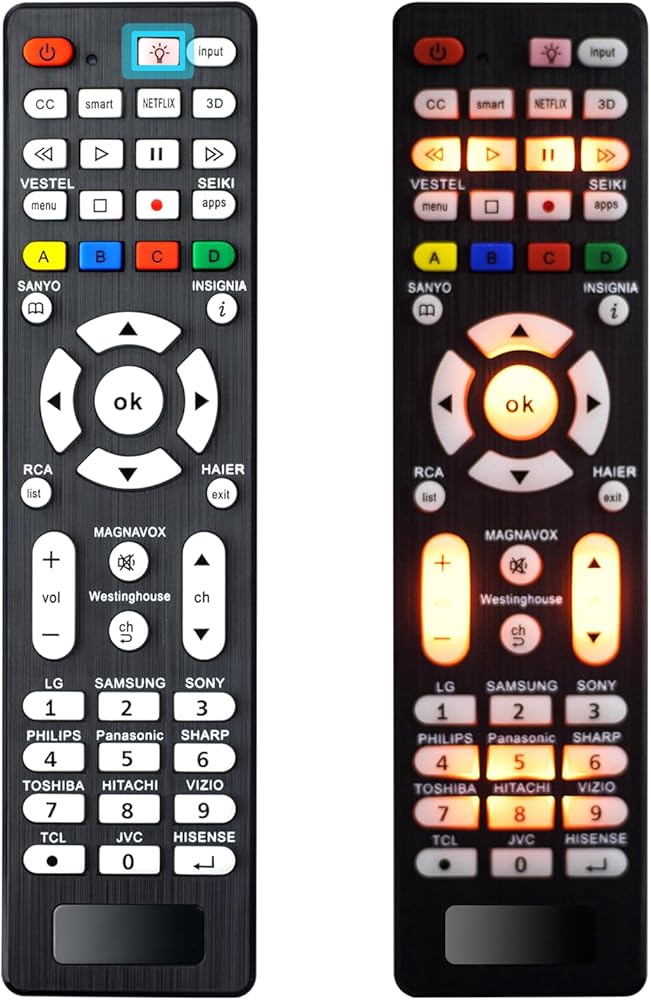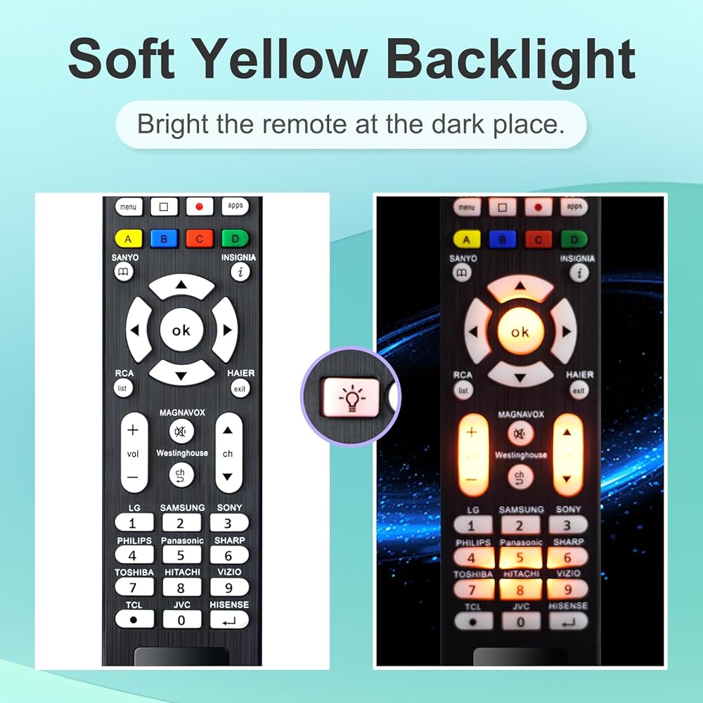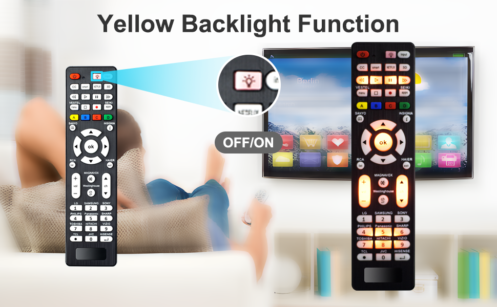 إضاءة خلفية صفراء ناعمة: جهاز التحكم عن بعد العالمي مجهز بأزرار فلورسنت، والتي توفر رؤية لتشغيل أزرار التحكم عن بعد في البيئات المظلمة.