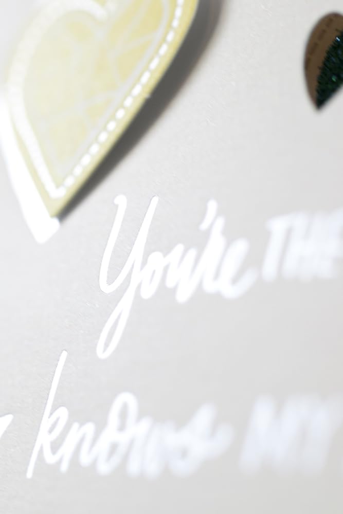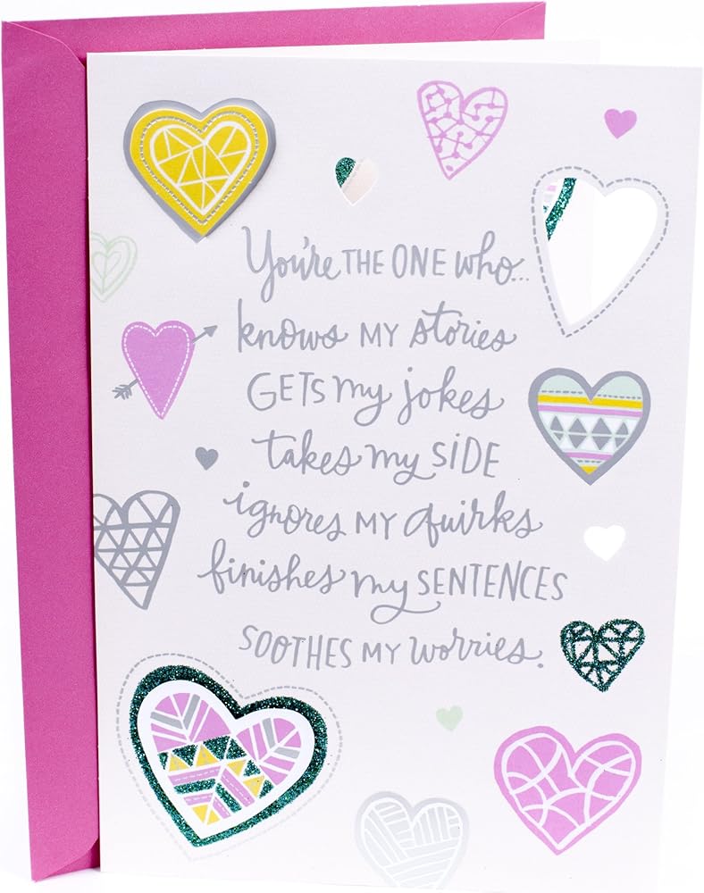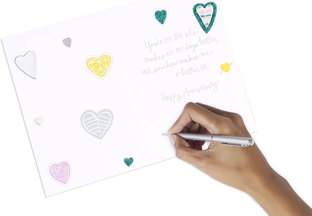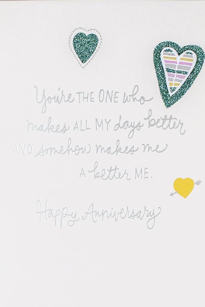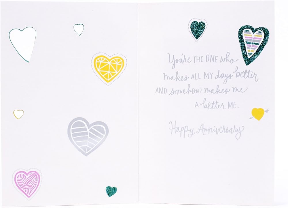 Commemorate your anniversary with this card to your spouse designed with hearts filled with colorful patterns on an off-white background. The message on the front of the card reads, "You're the one who... knows my stories gets my jokes takes my side ignores my quirks finishes my sentences soothes my worries." Open the card to reveal the inside message, "You're the one who makes all my days better and somehow makes me a better me. Happy Anniversary" The card measures 8.3 inches long by 5.8 inches wide made with high quality cardstock paper; an envelope is included. All Hallmark cards are made with paper from well-managed forests. Hallmark was founded in 1910 when 18-year-old J.C. Hall arrived in Kansas City, Missouri, with a couple of shoeboxes of postcards under his arm and the American dream in his heart. Today, more than a century later, Hallmark greeting cards are sold online and in nearly 40,000 retail stores across the globe and people continue to recognize the iconic Hallmark brand as "the very best."