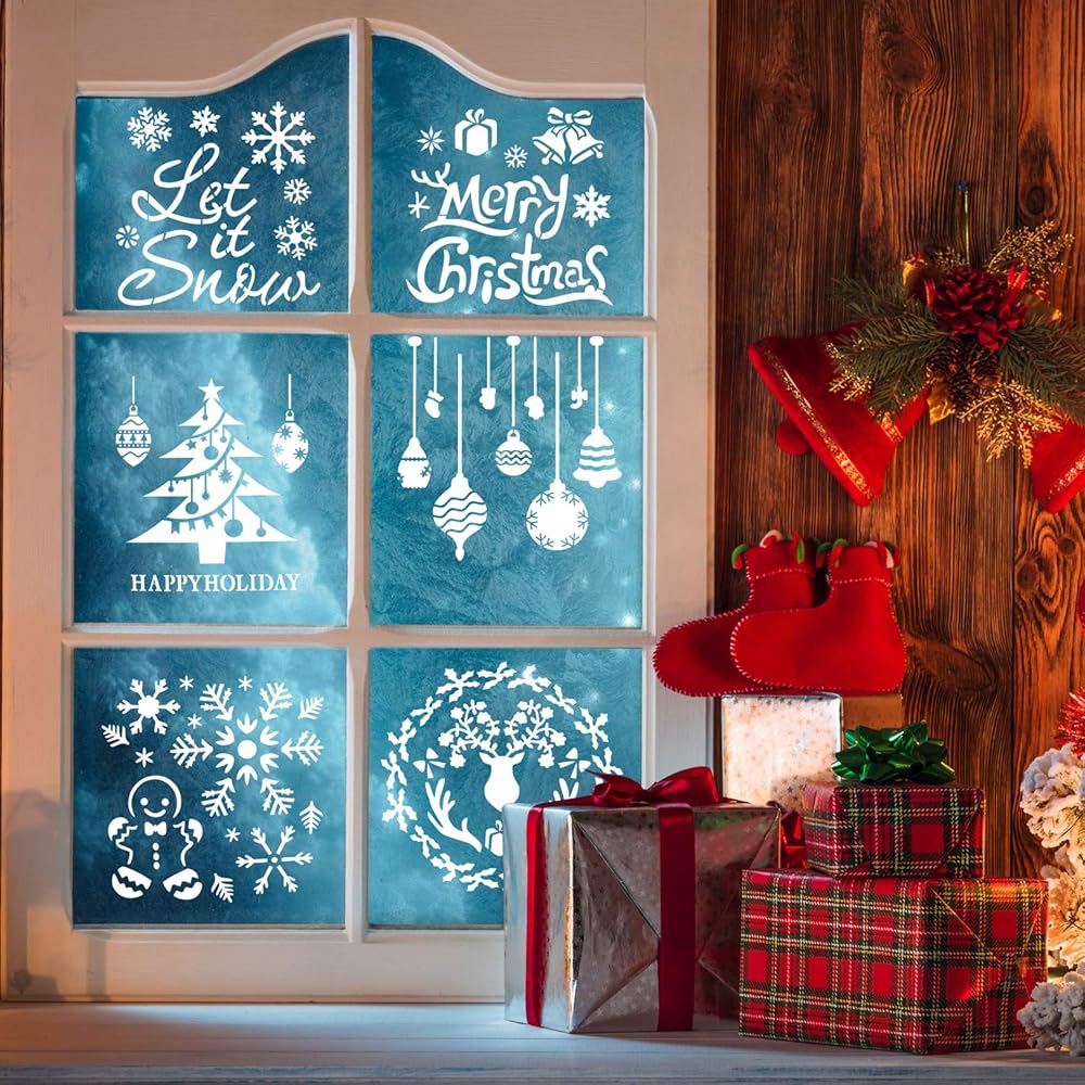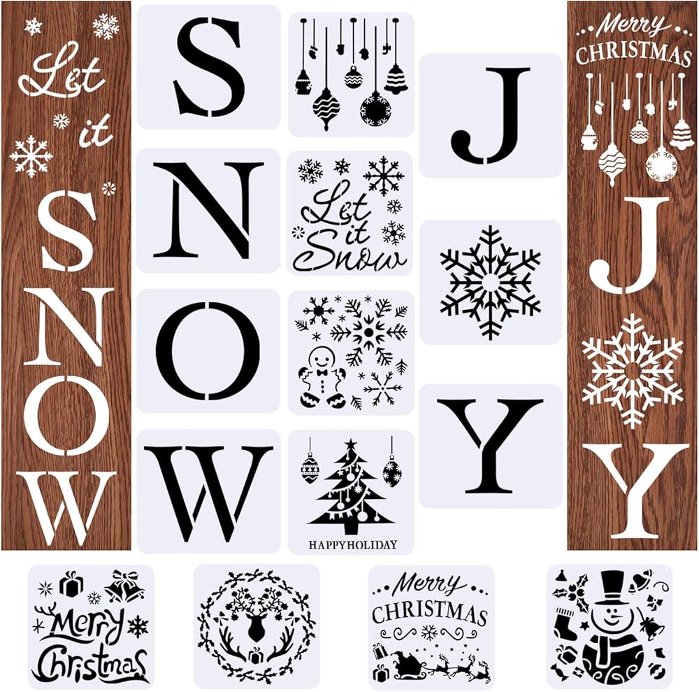 Package included: 15 pcs Christmas stencil templates. Different Christmas designs are offered to you, including let it snow, joy, snowflake, Merry Christmas, Santa, elk, Christmas trees, happy holidays and more