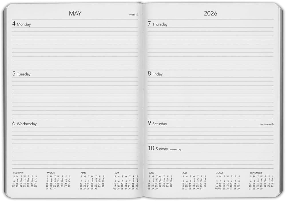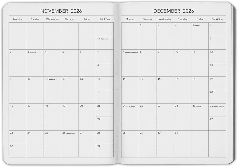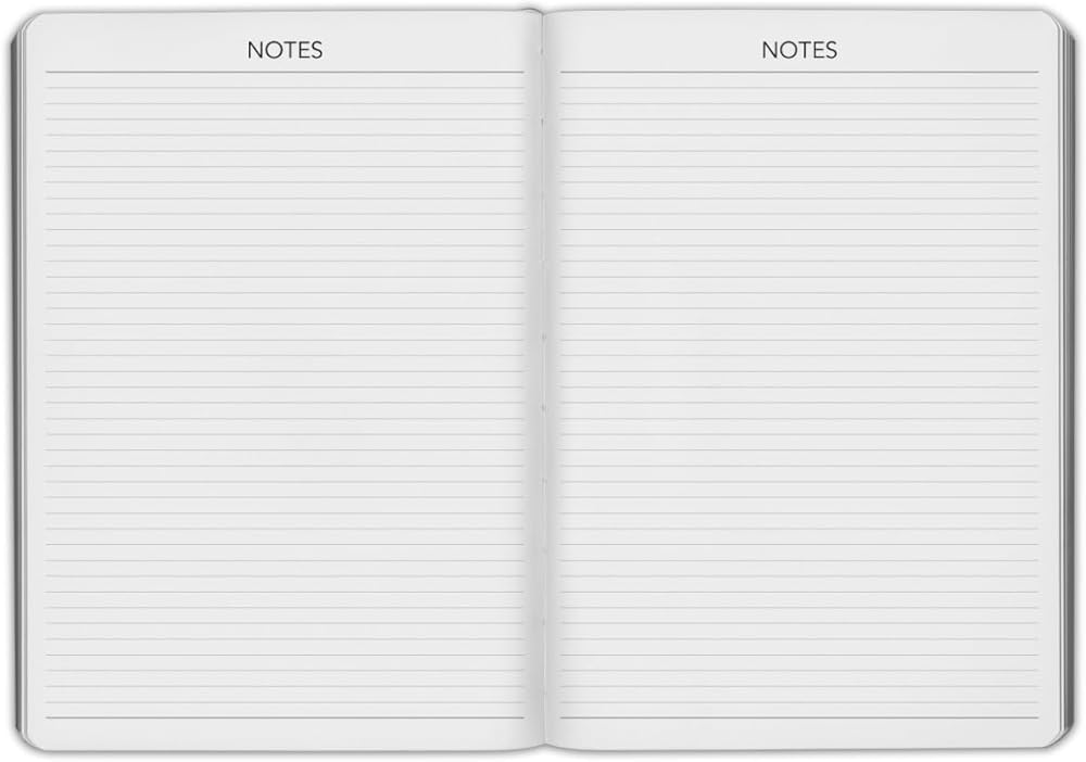 • Main Section – Two-page monthly spread in the front, followed by a two-page spread for each week starting Monday and ending on Sunday, with a lined section for each day for note-taking. Also includes additional Notes pages in the back.