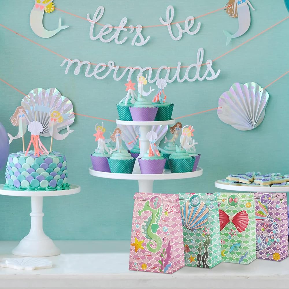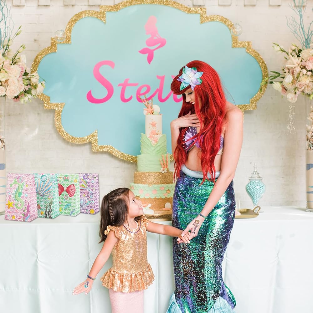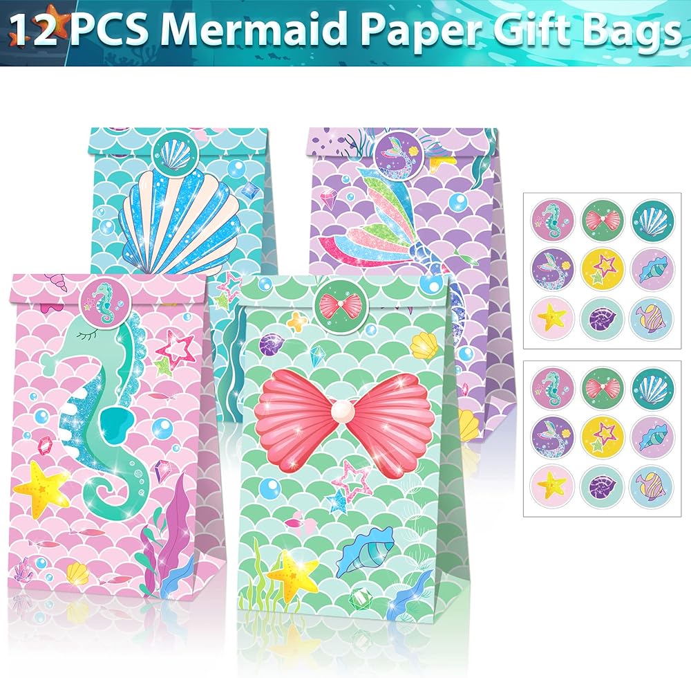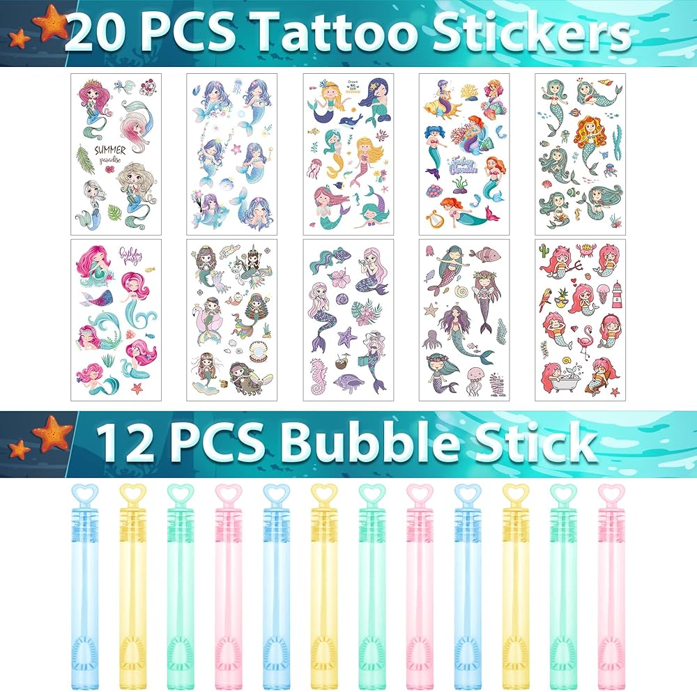 • VARIOUS STYLES - Mermaid theme party favor set contains:12 Gift Box(4style),12 Bubble stick(4style),12 Silicone Bracelet,20 Tattoo Stickers(10style),12 String bead(4style),12 Slap Bracelet(12style).