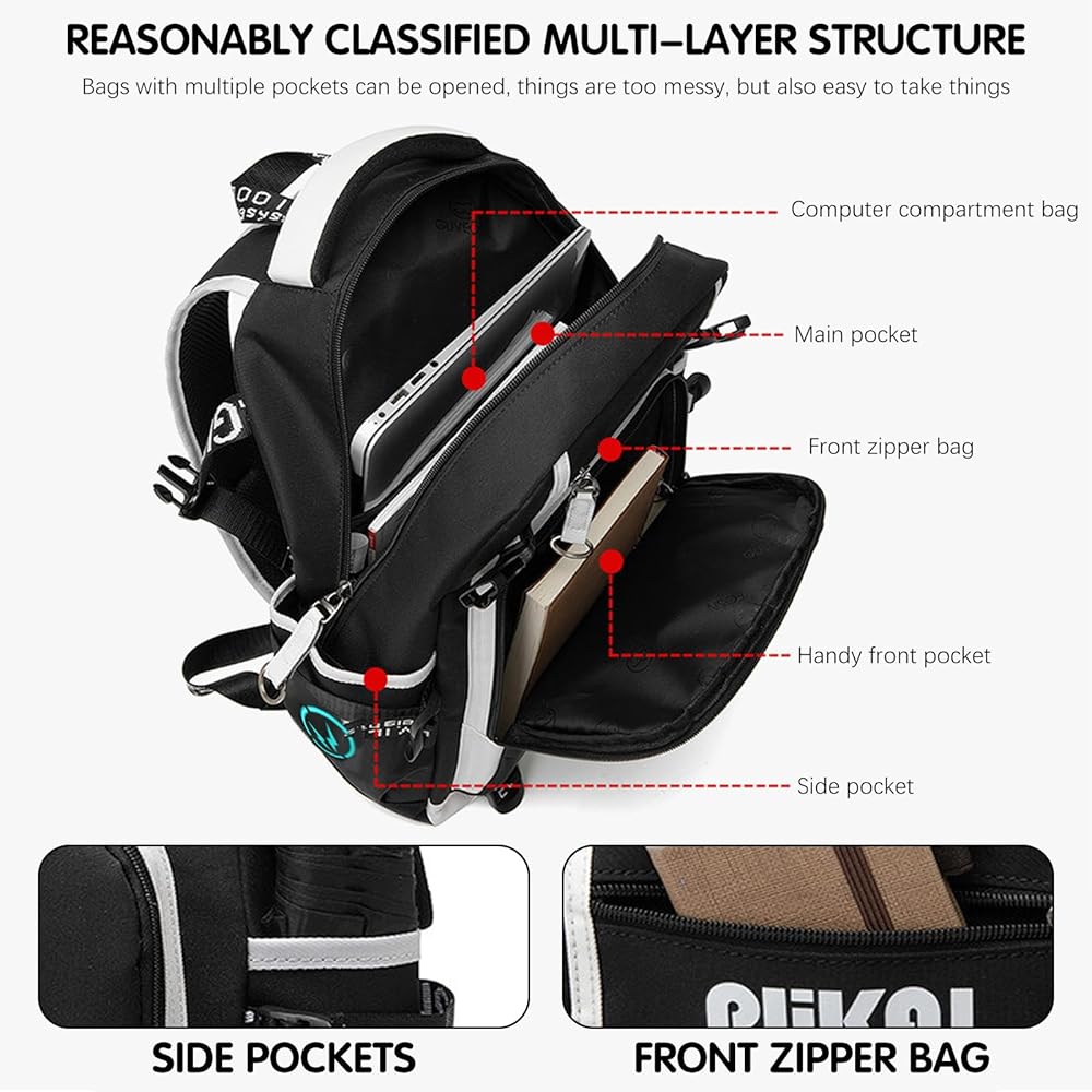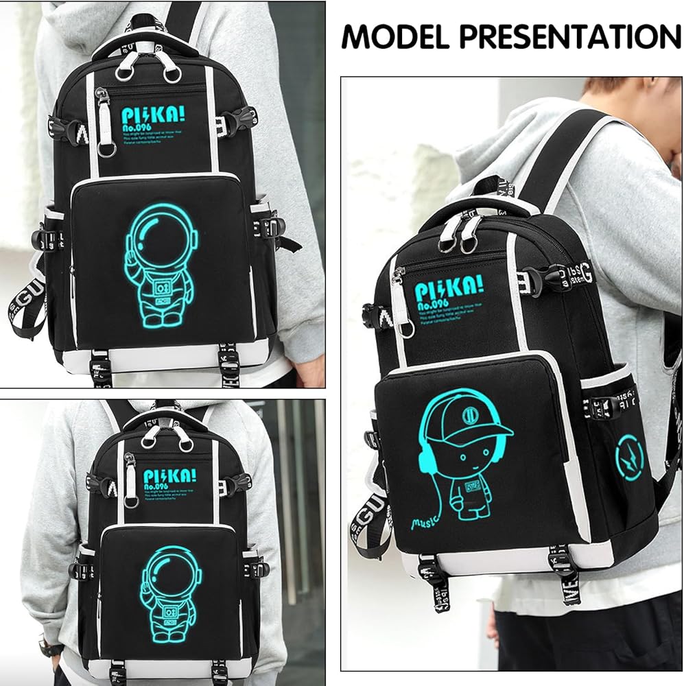 • وظيفة الشحن والإضاءة الليلية: يحتوي جانب حقيبة الظهر اللطيفة على منفذ شحن USB ومقبس سماعة الرأس، والذي يمكن شحنه بسهولة أثناء المشي، مما يحرر يديك تمامًا. يمكن لتصميم شخصية الموسيقى الكرتونية الإبداعية أن ينبعث الضوء في الليل، مما يجعل حقيبة السفر للرجال مليئة بالرقي وأكثر فريدة من نوعها.