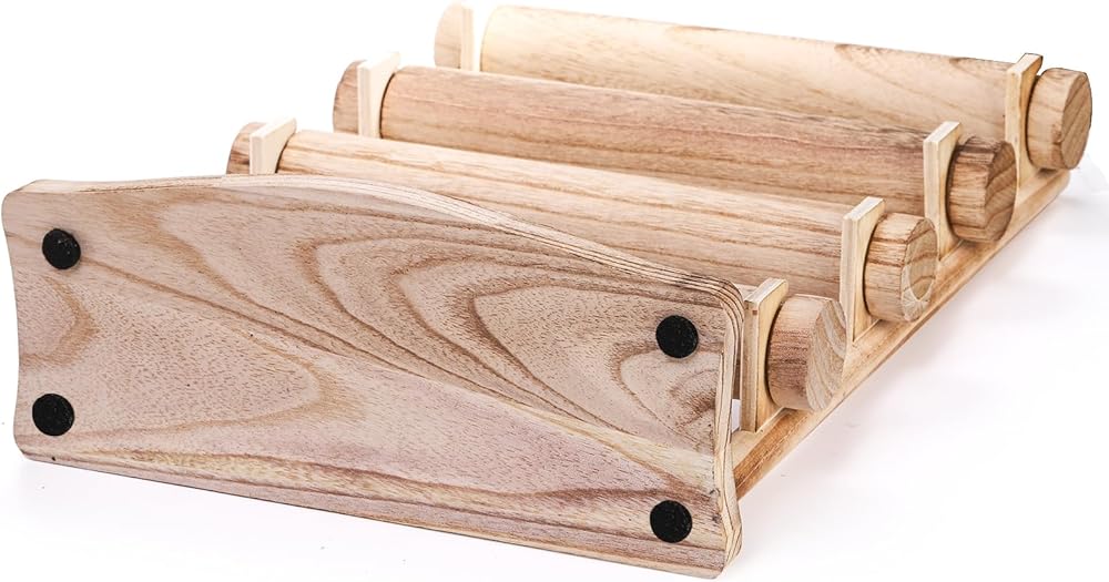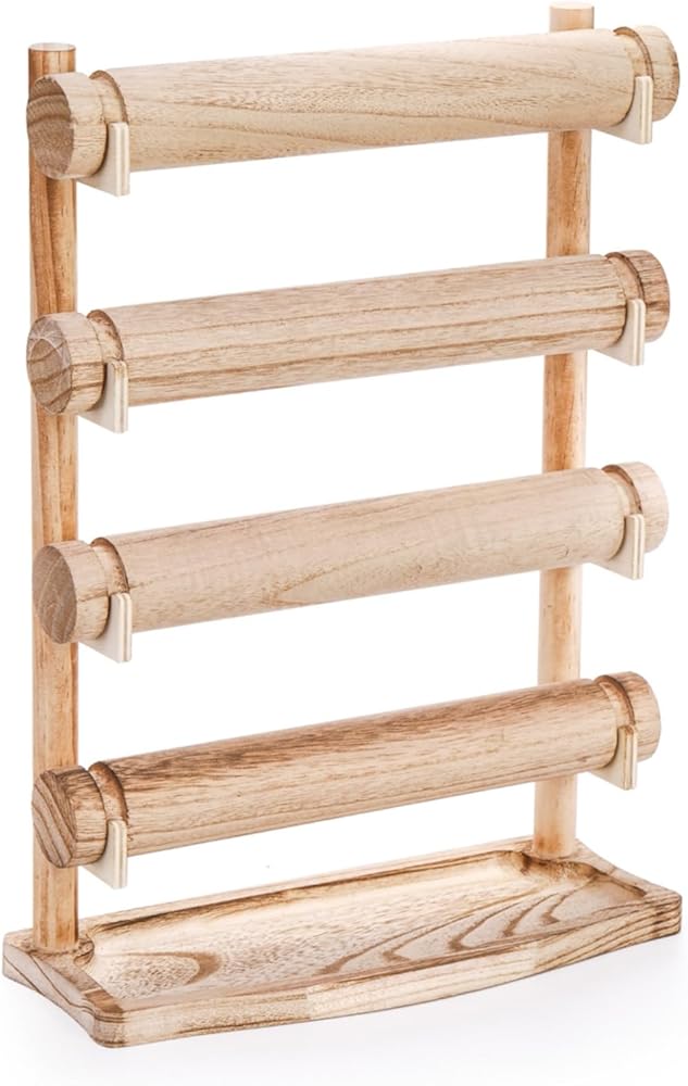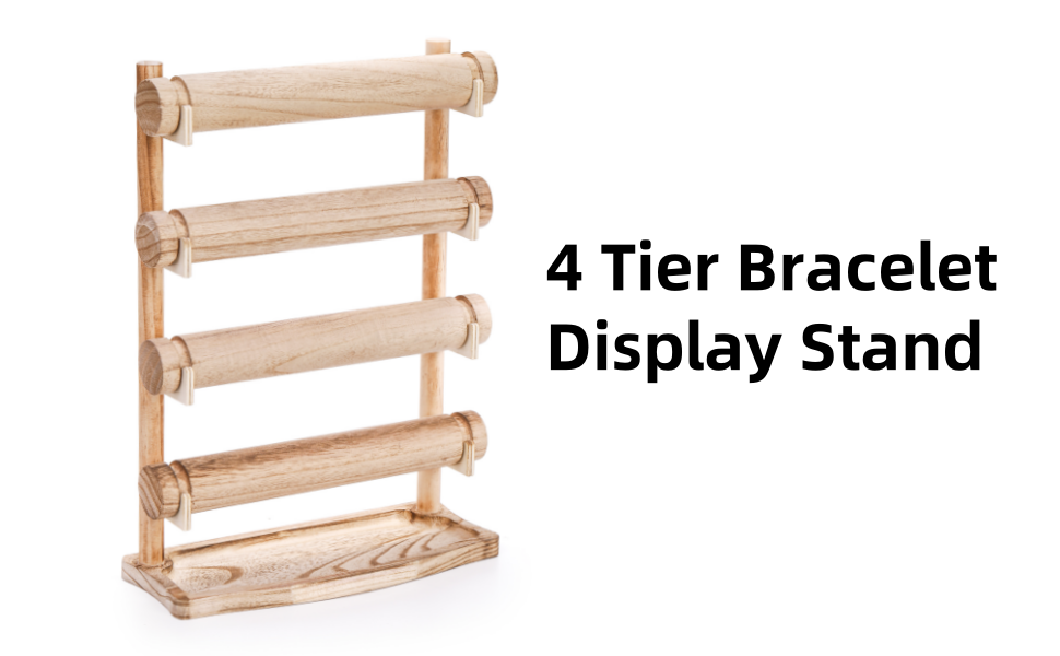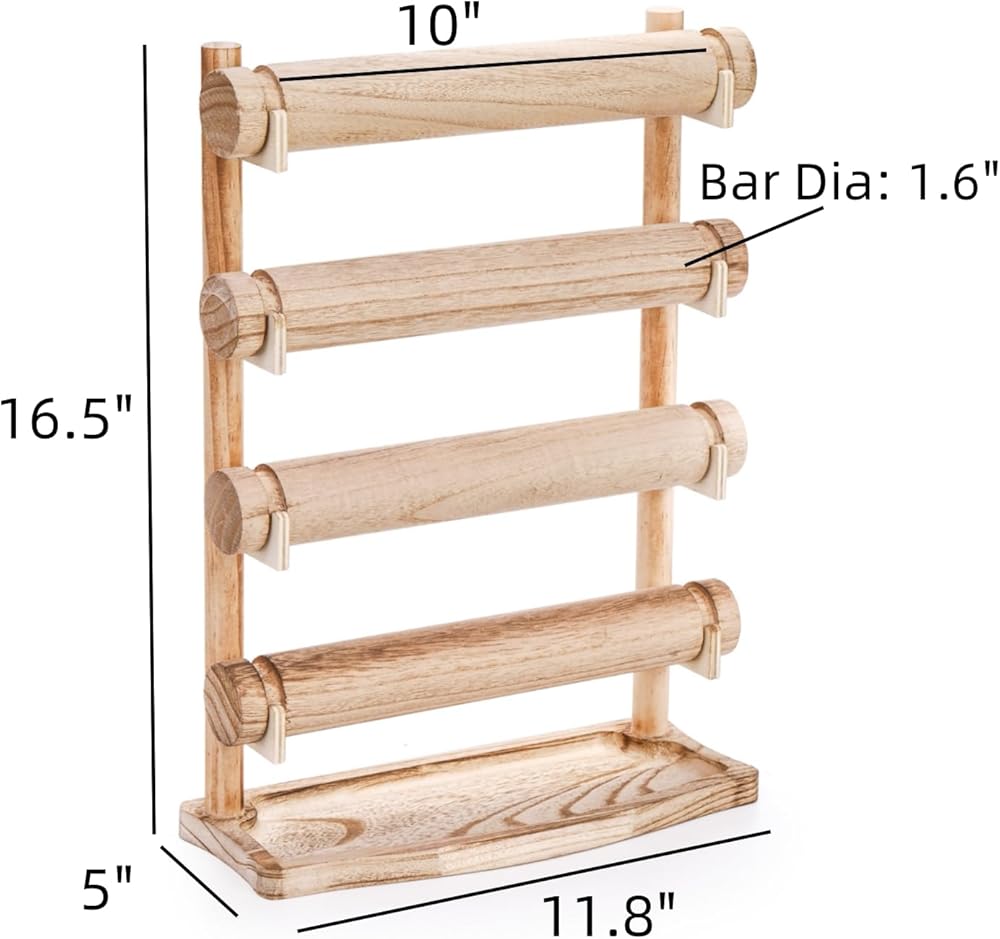 • حامل سوار خشبي من 4 طبقات مع صينية سفلية، الحجم: 11.8 بوصة طول × 5 بوصة عرض × 16.5 بوصة ارتفاع. 4 قضبان إزالة، الحجم: 11.8 بوصة طول × 1.6 بوصة عرض. حامل حامل صغير وأنيق، يوفر مساحة كبيرة لتنظيم أغراضك المجوهرات وحافظ على مكانك منظمًا وواضحًا لتحصل على ما تحتاجه في لمحة واحدة