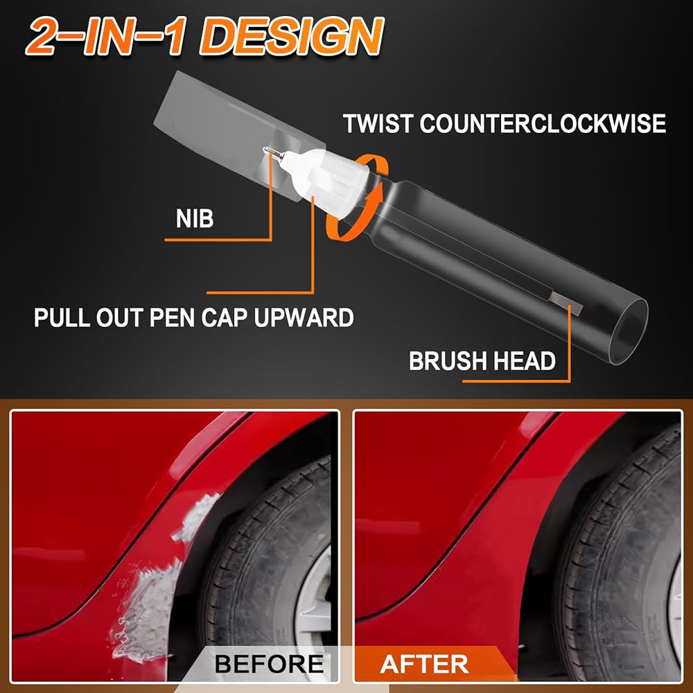 【تصميم 2 في 1】قلم الطلاء الخاص بنا هو تصميم ذو طرفين مع طرف معدني وفرشاة، مما يجعل إصلاح خدوش طلاء السيارة أكثر دقة وأسهل. السن المعدني مخصص لإصلاح الخدوش الصغيرة، بينما الفرشاة مناسبة للخدوش الأكبر أو الأطول. تلبية جميع احتياجاتك.