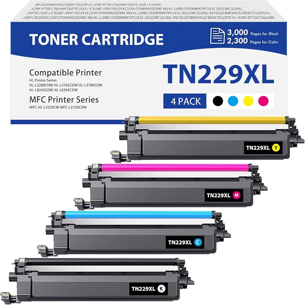 【Includes】:1 pack of compatible TN229XL Black toner cartridge, 1 pack of compatible TN229XL Cyan toner cartridge, 1 pack of compatible TN229XL Magenta toner cartridge, and 1 pack of compatible TN229XL Yellow toner cartridge (a total of 4 packs with chips).