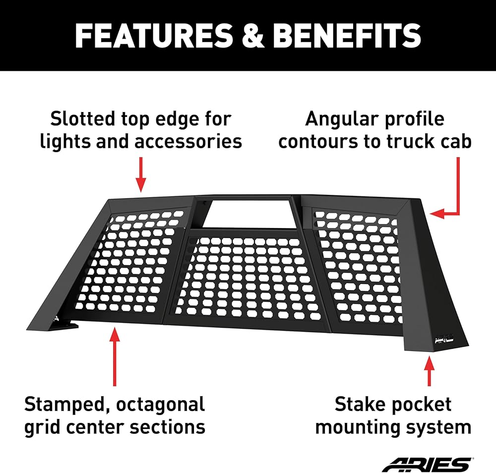 AGGRESSIVE STYLE. This offroad style truck headache rack adds an aggressive, aftermarket look to your pickup truck, featuring an angular design, custom contours for each application and a stamped grid center section