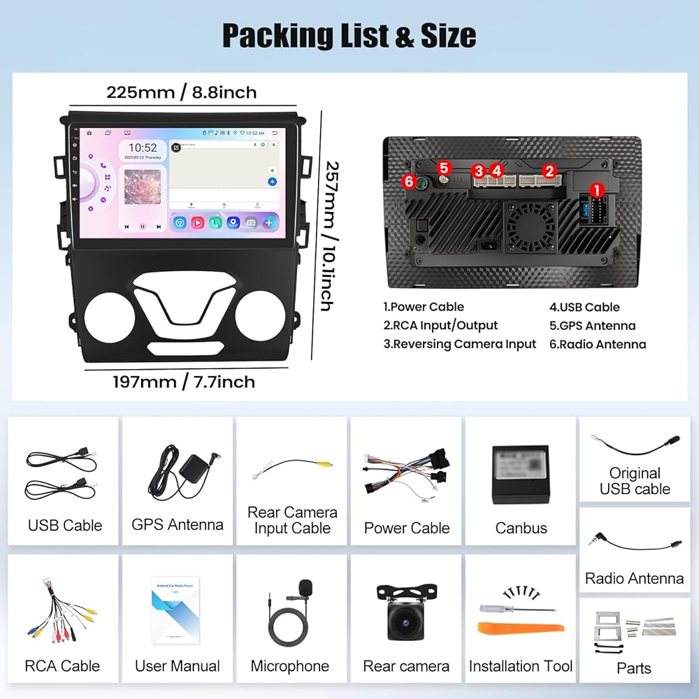 [2+64G 9 بوصة Android 13 راديو السيارة Ford Fusion Mondeo وHiFi/EQ-Audio] هذا راديو سيارة أندرويد عالي الوضوح 1080P لسيارة Ford Fusion Mondeo 2013-2019، شاشة كبيرة عالية الوضوح تسمح لك بالحصول على تجربة بصرية أفضل. تأثير صوت هاي فاي أكثر قوة، وتأثير صوت التحكم في التعديل 12 قطعة، يتيح لك الحصول على أفضل تأثير للاستمتاع بالموسيقى. تأتي الحزمة مع جميع الكابلات والإطارات التي تحتاجها، قم بالتوصيل والتشغيل. يتم تقديم ميكروفون وكاميرا مقاومة للماء كهدايا.