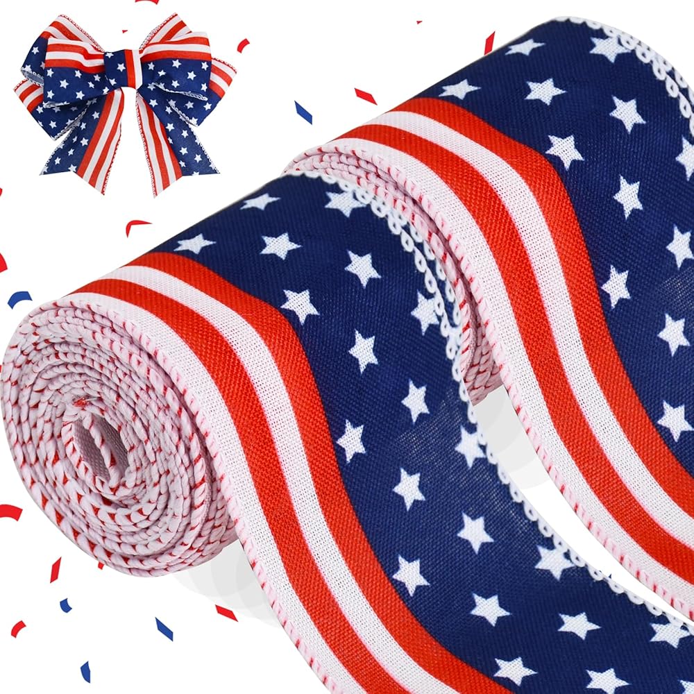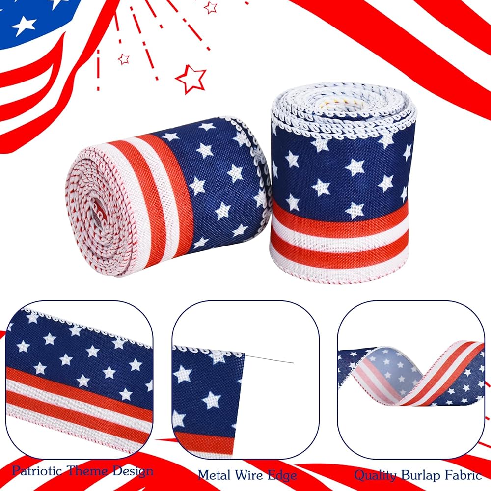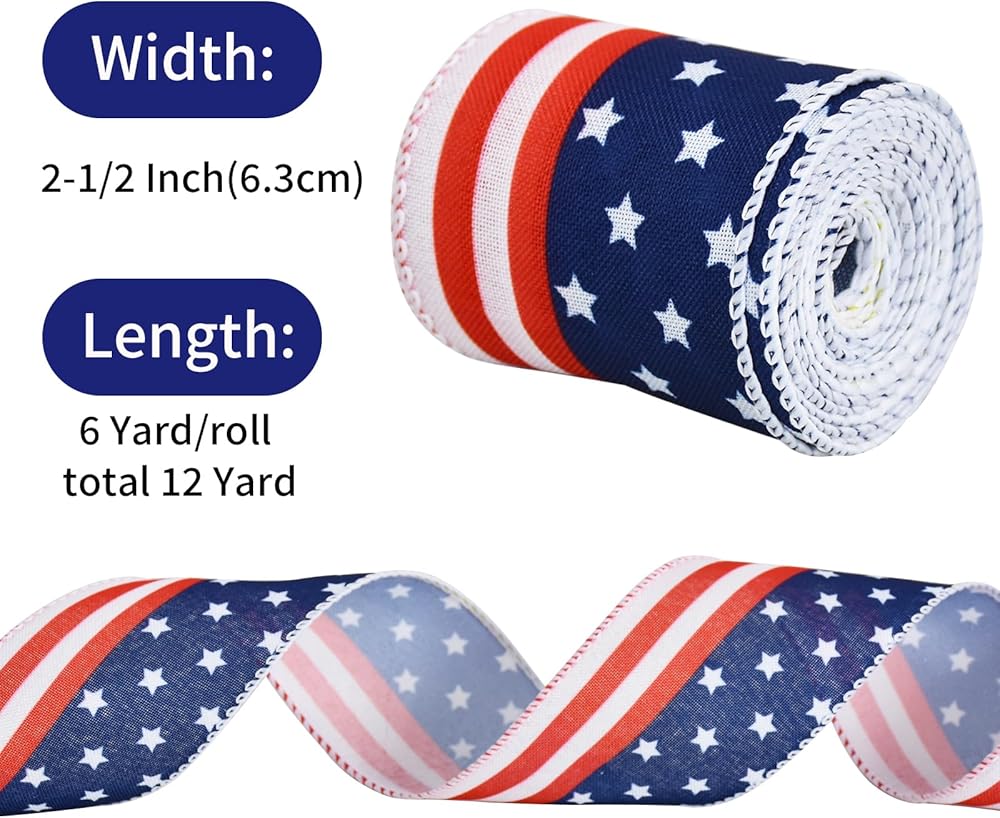 TONIFUL Patriotic ribbon well combines classic design with premium material, perfectly aligning with the theme of Independence Day. Our ribbons are suitable for any patriotic celebration, it is an ideal choice for Memorial Day, Election Day, Veterans Day, Labor Day, and 4th of July parties. Features: Ribbons are made from high-quality burlap material. The surface is smooth and soft without wrinkles, you don't need to iron before using it. [Specification] Material: Burlap Size: 6 yards (5.49 meters), width: 2-1/2 inches (6.3 cm) Style: American flags ribbon; Red, white and blue ribbon; Stars ribbon. Packaging includes: 2 rolls per pack Notes: 1. Please allow for slight dimensional errors due to manual measurement. 2. The winding risk may exist, please keep away from children. 3. Please allow slight color differences due to different monitors.