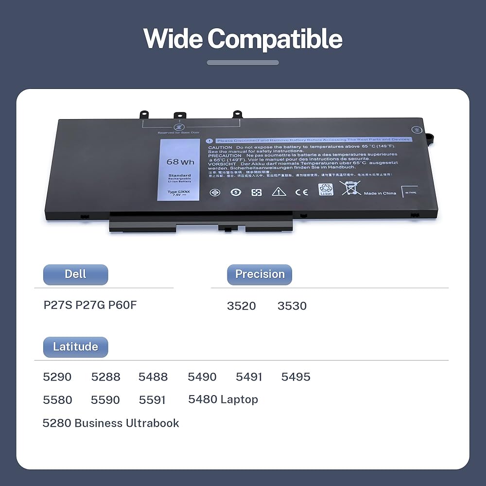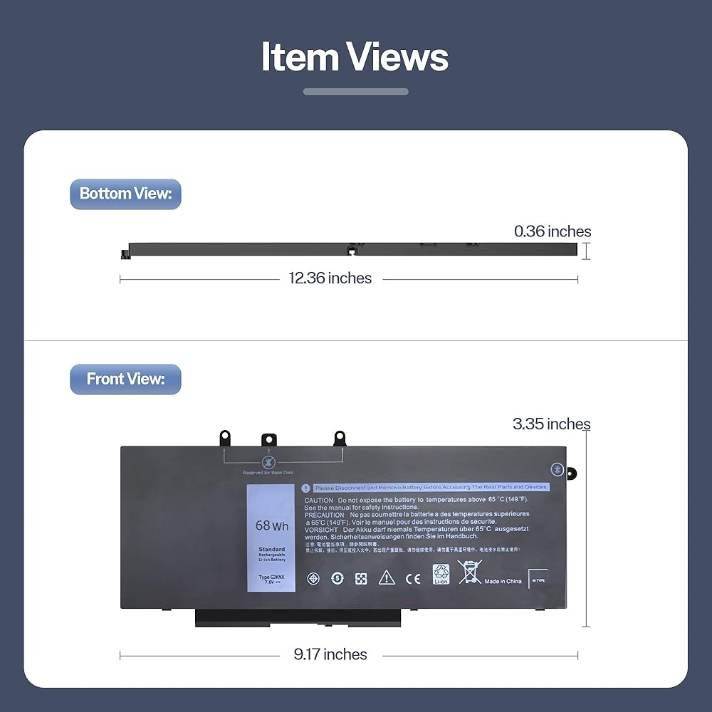 💻نموذج البطارية: GJKNX الجهد: 7.6 فولت؛ السعة: 68 وات في الساعة؛ الخلايا: 4 خلايا انتبه: يرجى مقارنة بطاريتك الأصلية بمقارنة صورة البطارية لدينا قبل الشراء للتأكد من اختيار طراز البطارية الصحيح. يرجى ملاحظة أن هذه البطارية لا تأتي مع كابل، فأنت بحاجة إلى الاحتفاظ بالكابل الأصلي.