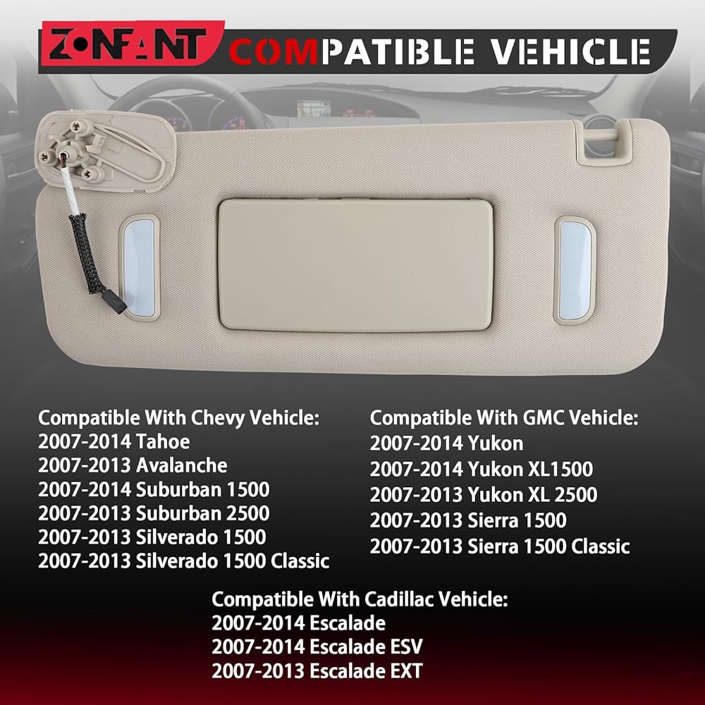 • 【Compatible with】 - Front left driver side sun visor compatible with 2007-2014 Cadillac Escalade, Escalade ESV, 2007-2013 Cadillac Escalade EXT | 2007-2013 Chevy Avalanche, Silverado 1500, Silverado 1500 Classic, Suburban 2500, 2007-2014 Chevy Suburban 1500, Tahoe | 2007-2013 GMC Sierra 1500, Sierra 1500 Classic, Yukon XL 2500, 2007-2014 GMC Yukon, Yukon XL 1500.