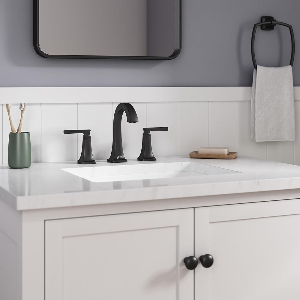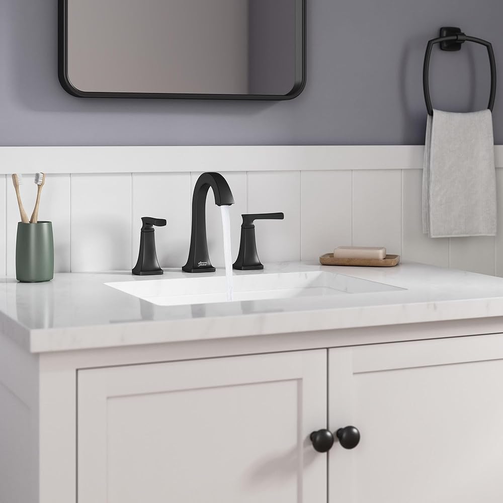 The Belmeade Two-Handle Widespread Bathroom Faucet from American Standard is a stately design with defined edges, a gently curved spout and sturdy lever handles. Impressive in any bathroom setting, the Belmeade faucet is easy to install for a quick update. This two-handle, 3-hole faucet promises drip-free performance, lasting beauty, and reliability in the busiest bathroom.