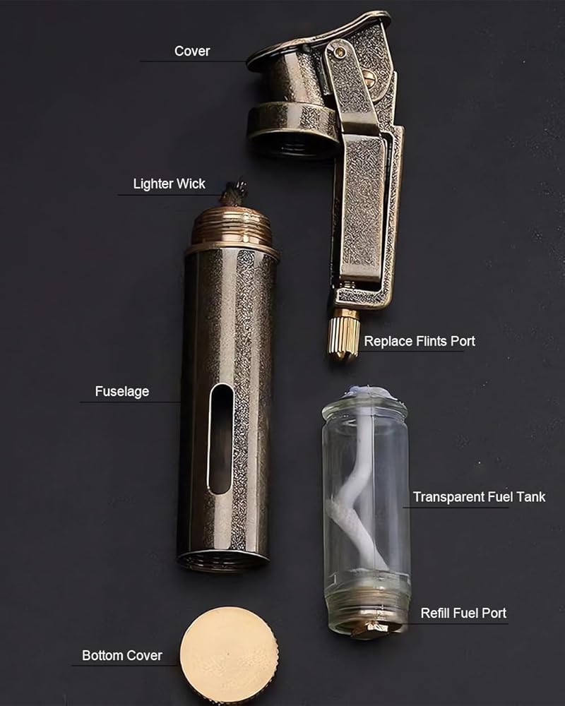 The lighter fuel is not included (NO lighter fluid included due to airmail regulations), all lighters are empty, so please fill with fuel before the actual lighting. Refillable for lifetime use, flint and wick are replaceable