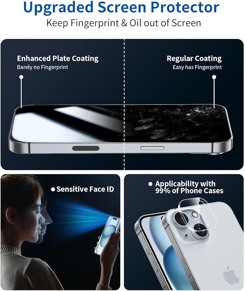 ✅تصميم صلابة فائقة 9H: طلاء شاشة شفاف عالي الوضوح بنسبة 99.99% مقاوم للماء والزيوت يحمي من العرق وبقايا الزيت من بصمات الأصابع. تغطي حماية التغطية الكاملة للشاشة شاشة iPhone 15 Plus مقاس 6.7 بوصة وتجعلها ملائمة للحافظة. سهلة التركيب للغاية.