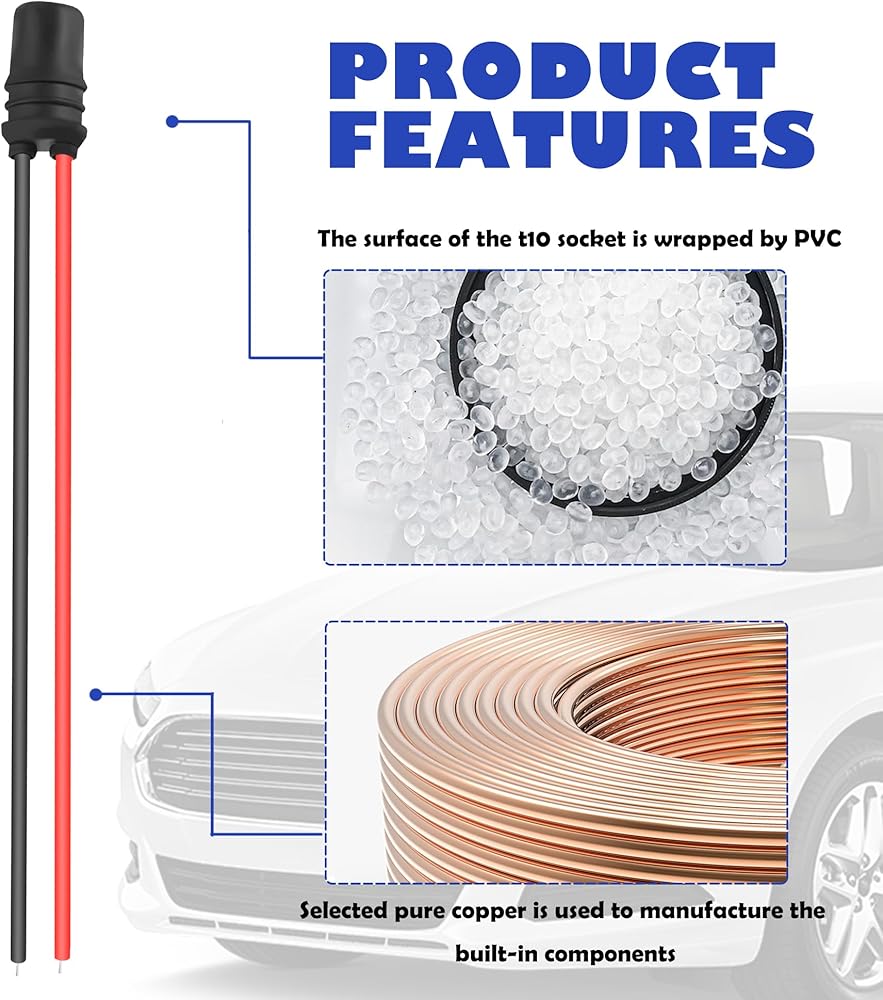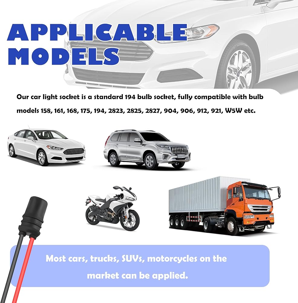 Model Specification - Our car light socket is a standard 194 bulb socket, fully compatible with bulb models 158, 161, 168, 175, 194, 2823, 2825, 2827, 904, 906, 912, 921, W5W etc. Most cars, trucks, SUVs, motorcycles on the market can be applied, which is your best choice for car accessories.