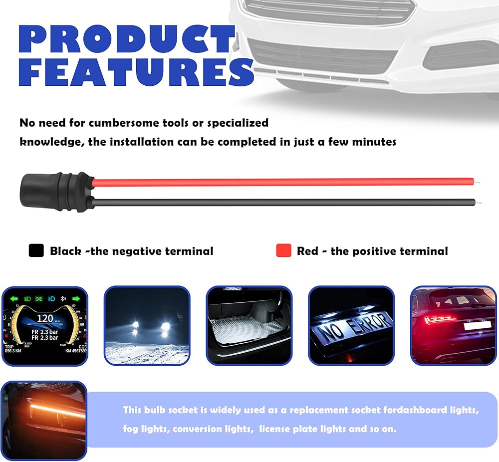 Simple Wiring - No need for cumbersome tools or specialized knowledge, the installation can be completed in just a few minutes, very simple and convenient. The 194 bulb socket pigtail comes with two wire harnesses, when installing, just remove the old or damaged connector, then please connect the black wire to the negative terminal and the red wire to the positive terminal.